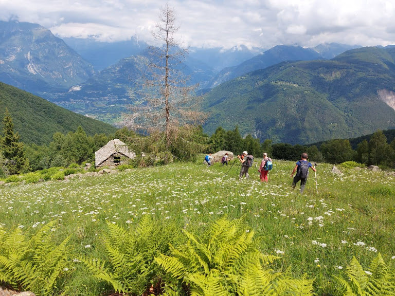 Una forte signora, colonna del gruppo, sopporta pazientemente un giovane lombardo e cinque anziani, due dei quali un po’ incattiviti dall’età (e lo dice un esperto). I nostri amici lacustri cominciano a spingersi verso nord con la giusta gradualità. Lo staff medico – sanitario controlla anche oggi il rispetto di tutte le regole dettate dalla prudenza in questa subdola pandemia. Il ritrovo è a Trontano. Dopo la piazza, alla rotonda, si sale a destra lungo la strada/pista per l’Alpe Parpinasca. Rispetto a quasi tre anni fa la strada è stata sistemata e si sale in auto senza grossi problemi. Inoltre, molto saggiamente, la sbarra non è chiusa e possono farne uso anche i contribuenti di serie B che ne hanno, appunto, contribuito non poco alla costruzione. Ciò permette di parcheggiare a quota 950, all’Alpe Faievo, risparmiando un’ora di cammino.