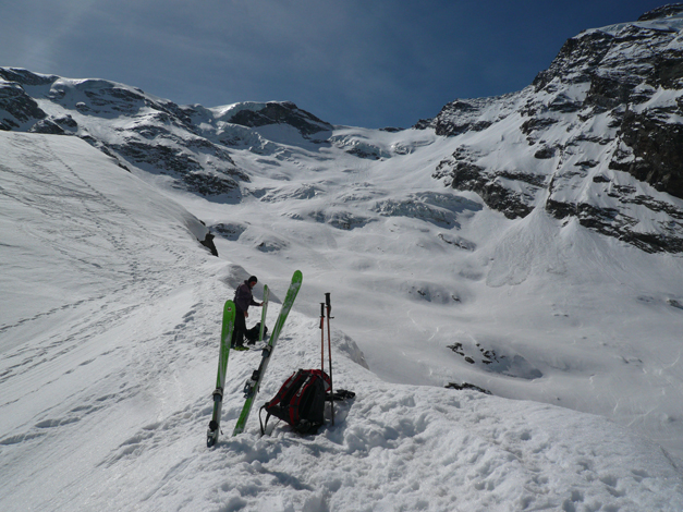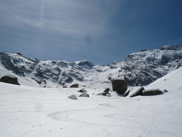Fin qui un’ora e mezza. Rinverdisco con Claudio qualche bel ricordo della nostra infanzia macugnaghese e poi si scollina sul ghiacciaio, dov'è stata tracciata una bellissima pista, che dà sicurezza a chi la segue. Dopo un’altra ora siamo al rifugio Zamboni, all'alpe Pedriola, quota 2065. Oggi le condizioni sono veramente perfette, non c'è vento, non è troppo caldo. La pista tracciata prosegue oltre e la seguiamo fin dove termina, lasciandoci sulla sinistra i ripidi pendii, splendidamente innevati, che salgono verso il Pizzo Bianco.