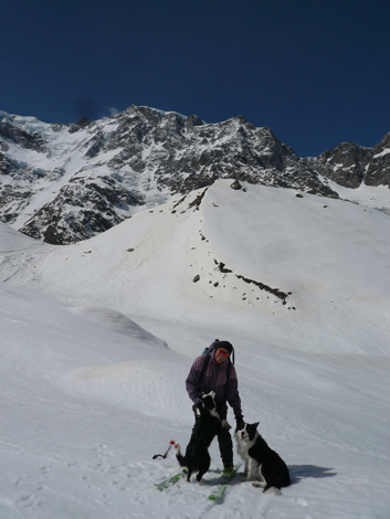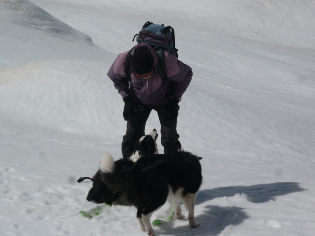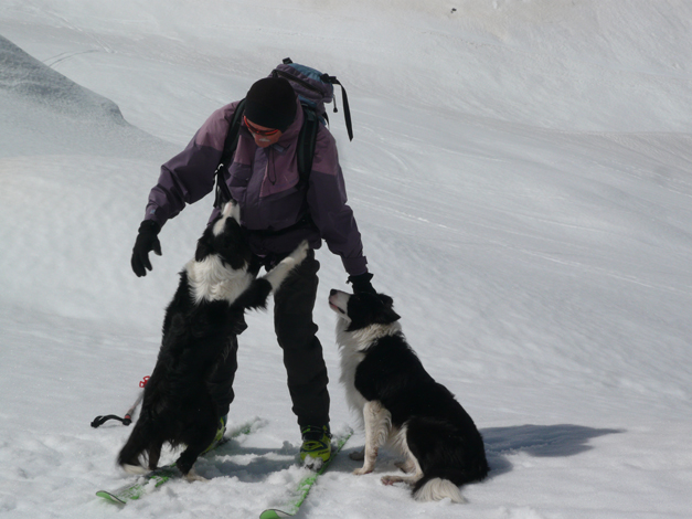 Oggi ci siamo separati dagli amici del giovedì, che preferiscono i bei percorsi della Val Grande e sono stufi della troppa neve di quest'inverno. Sandro ed io della neve non siamo mai stanchi e partiamo per Macugnaga con i nostri border collie, Asia e Book, felicemente fidanzati, ai quali non è consentito scegliere fra erba e neve. Ci avviamo sci ai piedi già dalla biglietteria degli impianti di Pecetto, quota 1358. Condizioni di assoluta sicurezza lungo il nostro percorso, temperatura ottimale (0 °C) e neve compatta. La seggiovia in settimana è ferma e la pista è a completa disposizione nostra e di pochissimi altri. Sandro è alla seconda uscita dopo sei mesi di stop forzato e siamo entrambi reduci da una vacanza al caldo che ci ha ulteriormente impigriti.