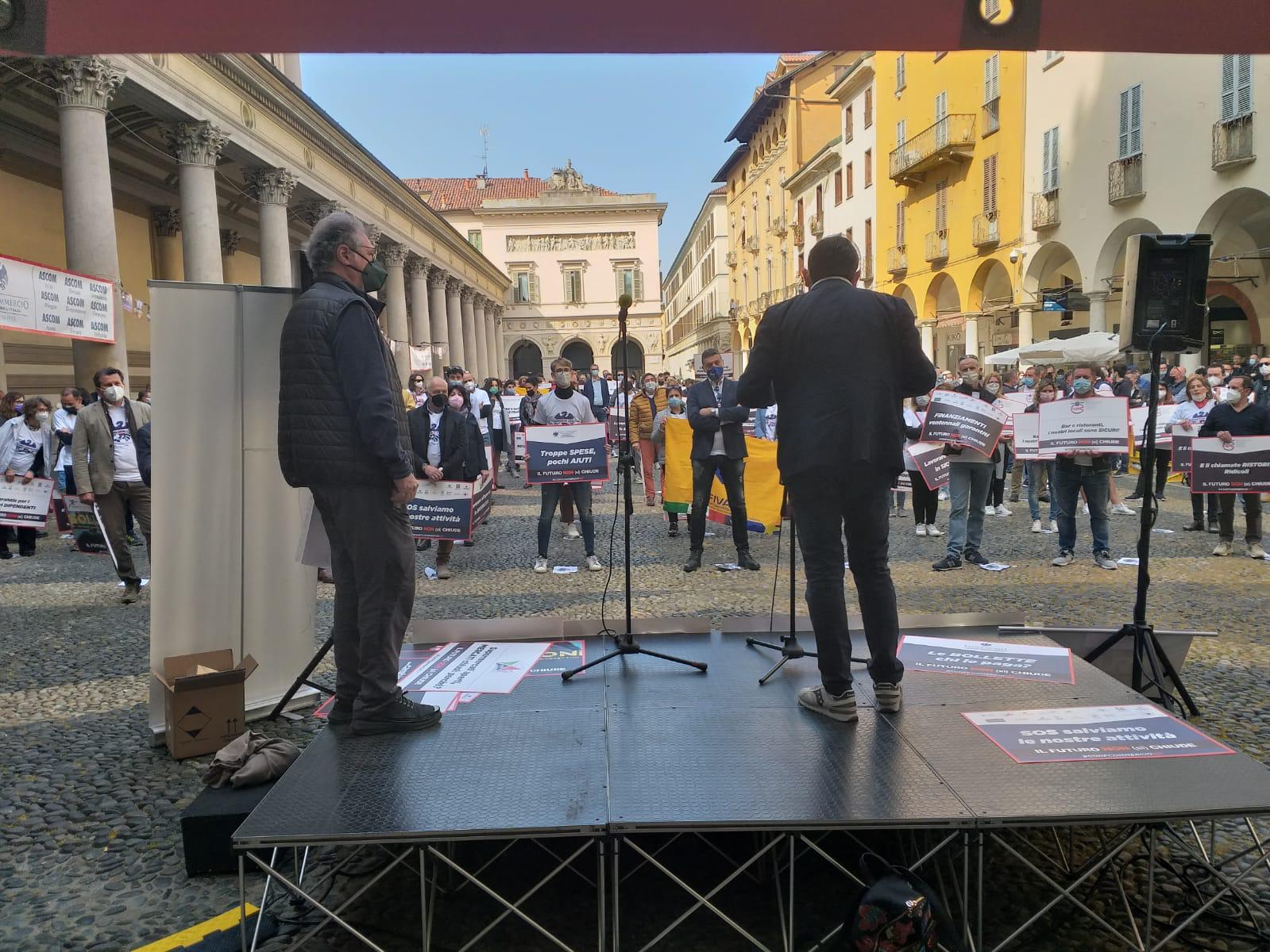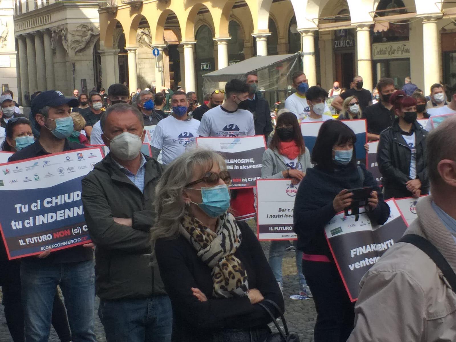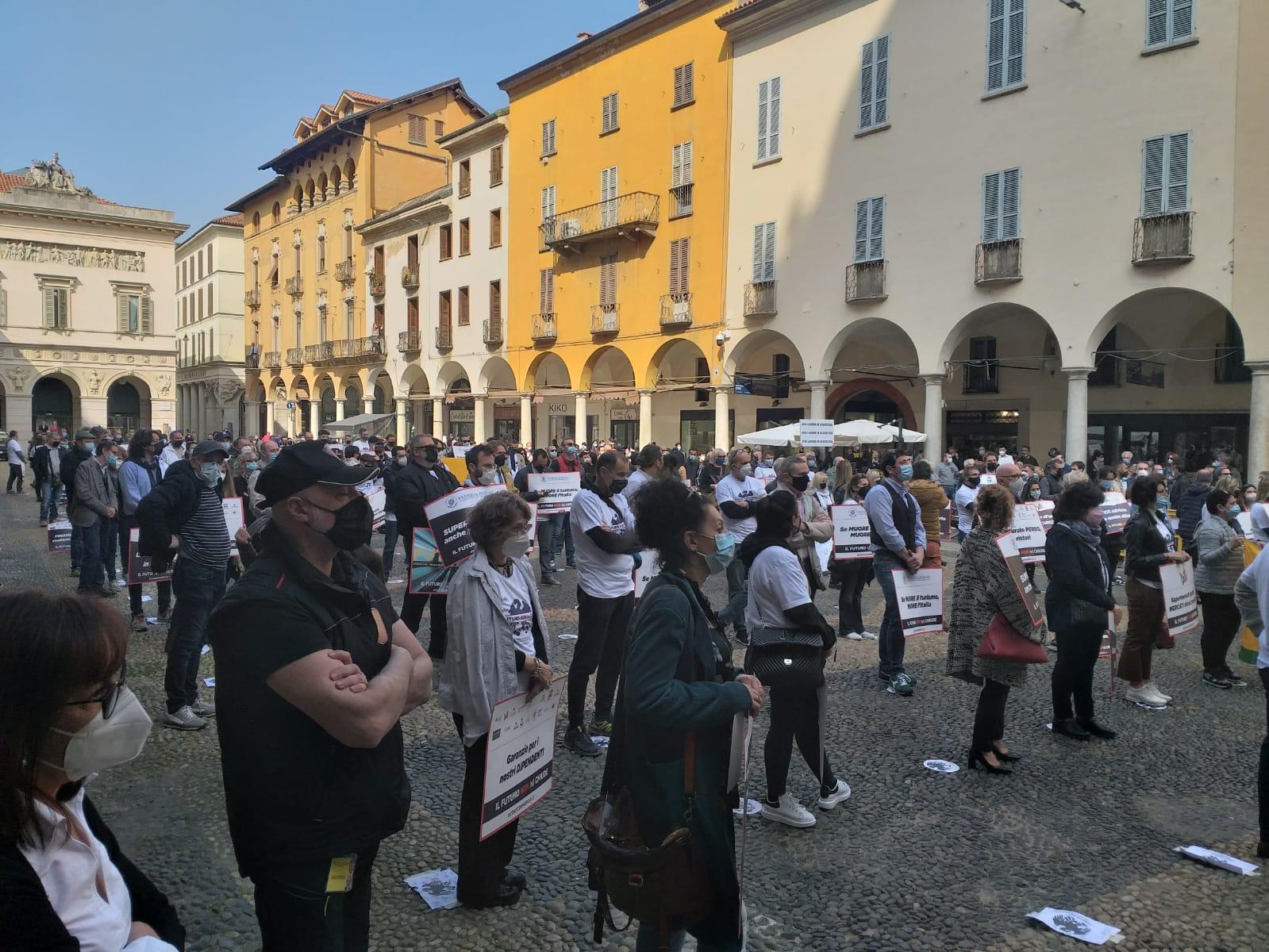 NOVARA - 01-04-2021 - Intensa partecipazione degli esercenti di VCO e Novarese che questa mattina si sono ritrovati in piazza Duomo (piazza della Repubblica) a Novara, per la manifestazione organizzata da Confcommercio Alto Piemonte contro le chiusure dei pubblici esercizi.