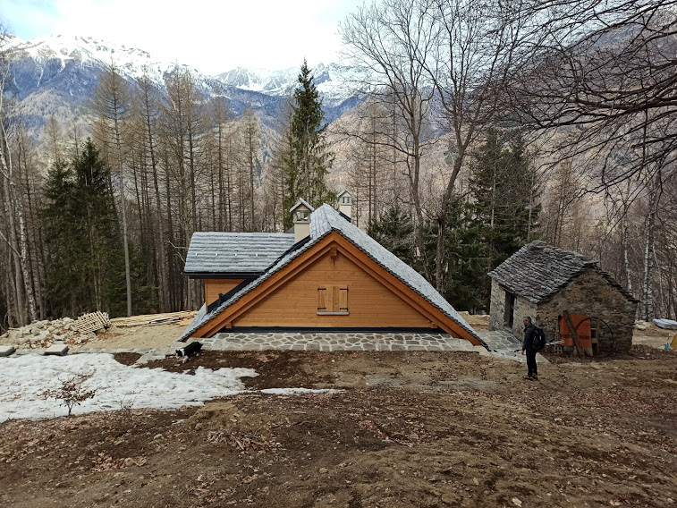 Camminiamo adesso su tanta neve compatta che ci fa pensare alle bellissime sciate in pista che ci siamo persi per colpa del virus maledetto e delle scelte di una politica poco informata in quel di Roma. Seguiamo comodamente la strada per Torcelli, senza bisogno di ciaspole o ramponcini, e, poco prima dell’Alpe, a quota 1400 circa, troviamo il bivio per l’Alpe Casale. Si scende velocemente nel bosco, con neve buona fino a quota 1200 e poi sul sentiero evidente fino ai ruderi dell’Alpe Casale, 1135. A Cascina Vè, 996, c’è un bellissimo chalet in costruzione ed arriva una strada. Niente di strano. Nel bel bosco di faggi arriviamo a Bei, 741, dove ci sfamiamo. Circa due ore dal Lusentino.