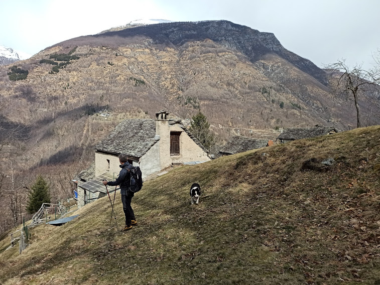 Il vento freddo e fastidioso dei giorni scorsi, che ci aveva dato oggi un po’ di tregua, torna a soffiare e ci rifugiamo nella baita ospitale di cari amici. Lungo la strada raggiungiamo la provinciale che sale al Lusentino, l’attraversiamo e seguiamo il sentiero verso Vagna fino a un bivio. Stiamo alti, a destra, ed incrociamo la mulattiera che scende da Prata. Rapidamente scendiamo a Maggianigo (meno di un’ora da Bei). Asia si fa un breve sonnellino fino a Domodossola.
