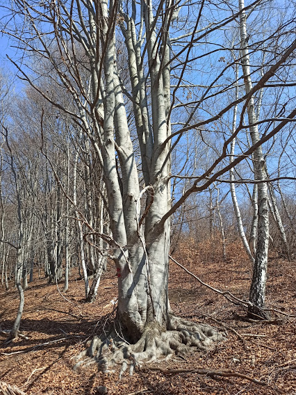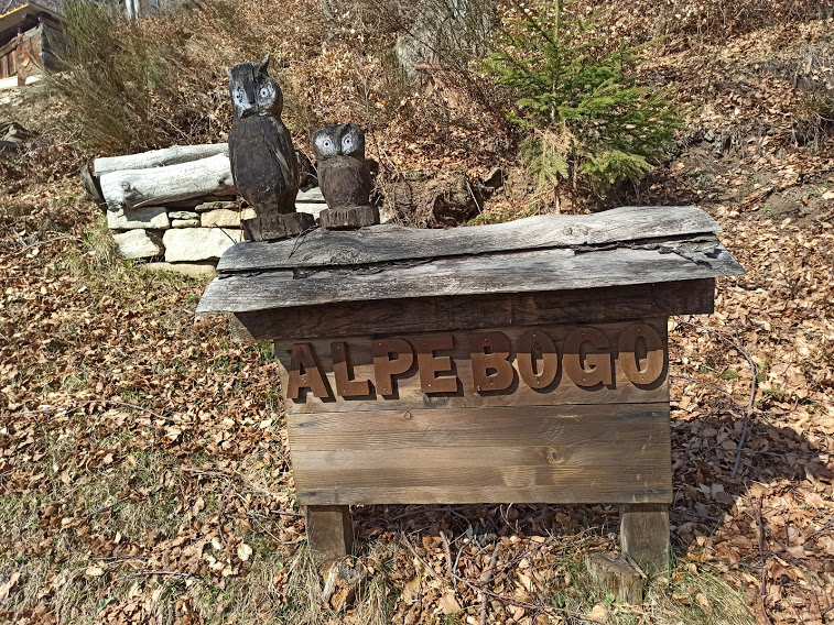 Un altro tratto di strada e, di nuovo su sentiero, eccoci all’Alpe Tresenta, 1170. Qui il bosco è più rado. All’Alpe Bogo Sotto, 1195, una breve pausa. L’ultimo sforzo ci porta all’Alpe Corte dei Raffi, 1384, dopo un’ora e venti minuti. Qui finisce anche la strada e troviamo un po’ di neve. Ci permettiamo una rapida colazione. I cartelli segnaletici, sia qui che più in alto, sono stati vandalizzati: la civiltà è arrivata anche ai piedi del Moncucco. Qui si arriva anche da Foppiano, sopra Lusentino, con un bel sentiero che avevo percorso qualche decennio fa. E’ ancora indicato sulle cartine, ma non so in che condizioni sia ora. Riprendiamo la salita nel bosco per un centinaio di metri, passando dal bivio, indicato e vandalizzato, per Casalavera Teniamo la sinistra (sud ovest) ed attraversiamo su una traccia evidente, iniziando finalmente ad abbassarci dolcemente, prati molto ripidi ancora “schiacciati” dalla neve appena sciolta. Incontriamo anche il residuo di una slavina.