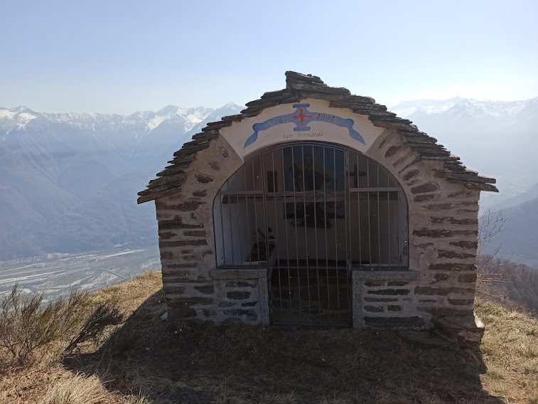 Serve attenzione. Arriviamo sulla cresta sud est del Moncucco, che dà sulla Val Brevettola e che chiamano anche “Filo del Moncucco”. Poco sotto troviamo la Cappella di San Bernardo, 1451, ristrutturata nel 2007. Tre quarti d’ora da Corte dei Raffi. Il panorama è grandioso, fino al Monte Rosa. Anche da qui la discesa sul sentiero evidente richiede attenzione, almeno per la mezz’ora abbondante fino all’Alpe La Colma, 1261, dove si opta per la pausa pranzo. Questo breve tratto, anche se molto ripido e impervio, è preferibile percorrerlo in salita. Di qui in giù la discesa è tranquilla e, passando in prossimità di Baione, 971, raggiungiamo, appena prima di Sogno, il sentiero diretto a Tappia, a quota 750 circa.