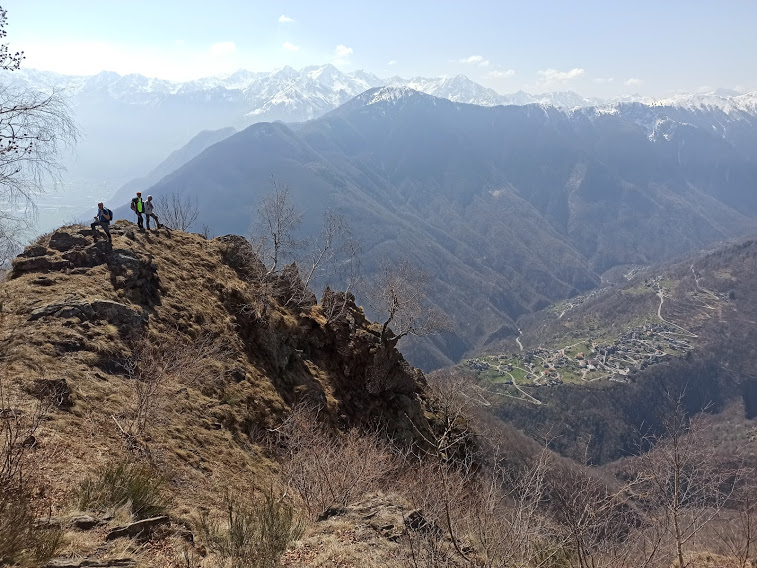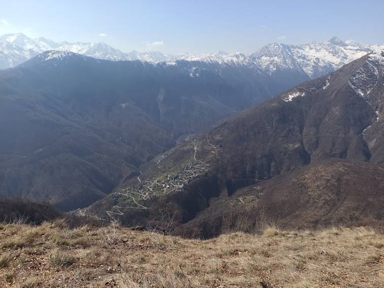 Un’altra giornata stupenda e troppo calda per essere a fine marzo, con la pandemia che continua a limitarci, mi vede, con la vivace compagnia di Asia, posteggiare in prossimità del cimitero di Crosiggia, 402, frazione alta di Domodossola. Il programma, piuttosto ambizioso, è di percorrere in lungo e in largo il versante orientale della montagna di Domodossola e Villadossola, il Moncucco. Lungo il sentiero più amato e frequentato dai domesi, con brevi strappi e tratti pianeggianti, arriviamo all’Oratorio di Sant’Antonio e alla borgata di Anzuno, 551. Attraversiamo il borgo e il Rio d’Anzuno in località Molini, 566, e, in breve, siamo alla Cappella Dell’Oro, 602. Qui le persone normali proseguono, quasi in piano, verso Tappia.