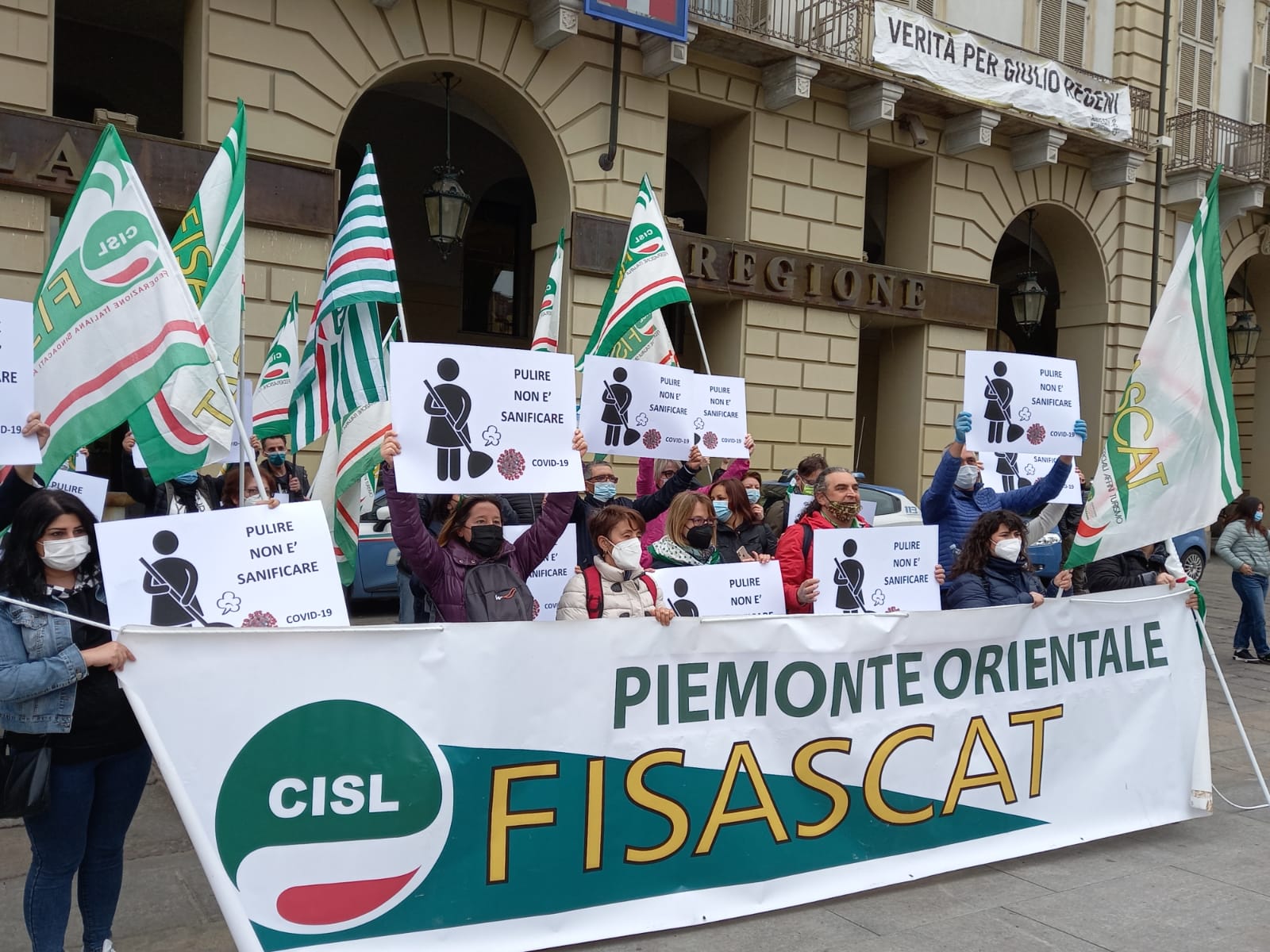 TORINO - 26-04-2021 - Alcune decine i lavoratori del settore di pulizia e sanificazione del Piemonte Orientale (Novara, Vercelli, Biella e Verbania) oggi hanno manifestato in piazza Castello a Torino, sotto la sede della Regione, contro gli eccessivi ribassi dell'appalto, aggiudicato alla società Markas Srl con un meno 30,12 % sulla base d'asta per il servizio nelle aziende sanitarie del territorio. Il timore è che un tale ribasso penalizzerà lavoratori e qualità del servizio. La Fisascat Cisl Piemonte Orientale ha proclamato per oggi lo sciopero del comparto per l’intera giornata. Sono circa 600 i lavoratori interessati. "Vogliamo massima trasparenza sul lotto 5 – spiegano i segretari generale Fisascat Cisl e Cisl Piemonte Orientale, Luca Trinchitella ed Elena Ugazio – che riguarda la pulizia e la sanificazione nelle aziende ospedaliere delle provincie di Biella – Novara – Verbania – Vercelli. Considerato che il costo del lavoro in appalti di questa natura rappresenta circa l’85% del totale dell’appalto, appare chiaro che un ribasso di tale portata non potrà che avere riflessi molto negativi sia nei confronti dei lavoratori, in termini di ore lavorate e sicurezza, sia nella qualità dei servizi delle strutture interessate”.