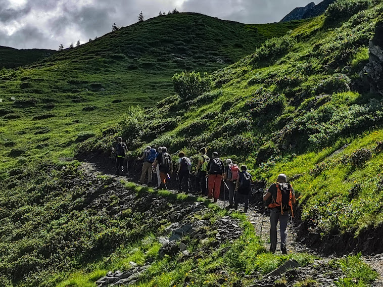 Rimaniamo in quota sempre lungo il sentiero SFT, diretti a sud ovest. Con dolci saliscendi passiamo dall’Alpe Paianascia e dall’Alpe Porcareccia. Nomi italici pur essendo oltre confine. Passiamo il bivio per il Passo Busin ed arriviamo a quello per il Passo Andolla. Questi fanno parte, insieme al Passo della Preia, al Passo Castello e alla Bocchetta dei Pianei, del noto e bellissimo Giro dei Cinque Passi. Qui, a quota 2150 circa, invertiamo decisamente la rotta verso nord (destra) e scendiamo. Siamo nuovamente sul sentiero TPA (dal Passo di Pontimia quasi un’ora e un quarto).