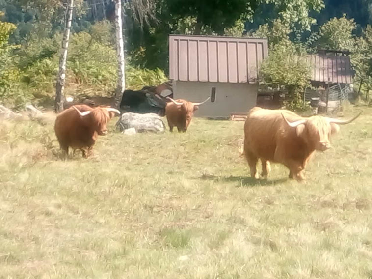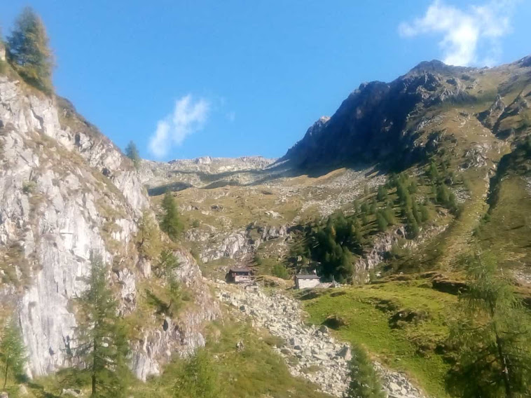 Molto simili, ma di provenienza diversa, sono le mucche Highlander scozzesi che abbiamo incontrato in Valle Vigezzo e in Valle Isorno negli anni scorsi. Usciamo dal bosco ed attraversiamo su un ponticello di legno il Rio Lasino, passando sulla destra orografica. L’ultimo strappo lungo il sentiero sempre evidente ci porta all’Alpe Asinello, 1831, in poco meno di un’ora. I forti del gruppo, cioè gli altri cinque, proseguirebbero volentieri, ma si lasciano contagiare dalla mia pigrizia e ci crogioliamo al sole di questa giornata ancora estiva.