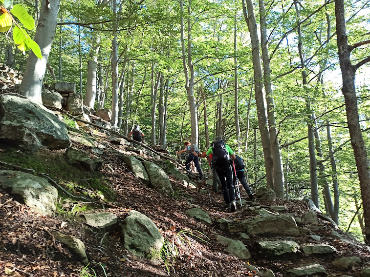Ci muoviamo di venerdì perché si tratta dell’unica giornata decente di una settimana perturbata. L’ombrello nello zaino mi garantisce che la pioggia prevista di pomeriggio verrà rinviata. Cinque anziani sono sopportati anche oggi dalla forte e paziente signora che è sempre con noi. Saliamo subito attraversando la frazione ed entriamo nel bosco. Il sentiero B20a è ripido e ci scalda subito.