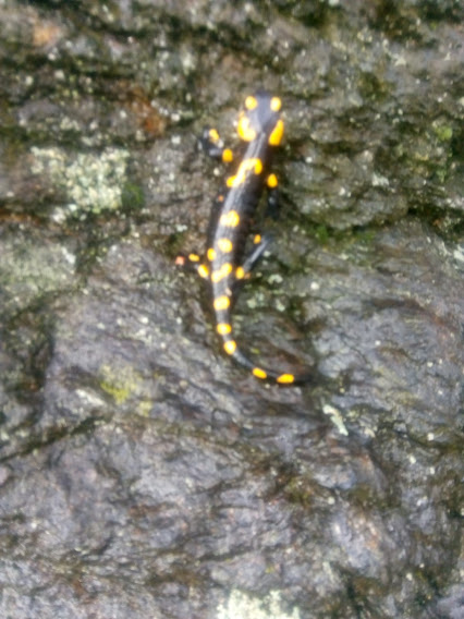 Sulla pista pianeggiante, con gli ombrelli aperti per ripararci dalle ultime gocce di pioggia, ci dirigiamo verso il Forte di Bara, a nord. Qualche salamandra si gode l’umidità. Pochi minuti prima di arrivarci incrociamo la Strada Cadorna, che è una meravigliosa mulattiera in perfetto stato di conservazione. Teniamo la sinistra ed iniziamo a salire lungo la perfetta, costante pendenza, tipica delle vere mulattiere.