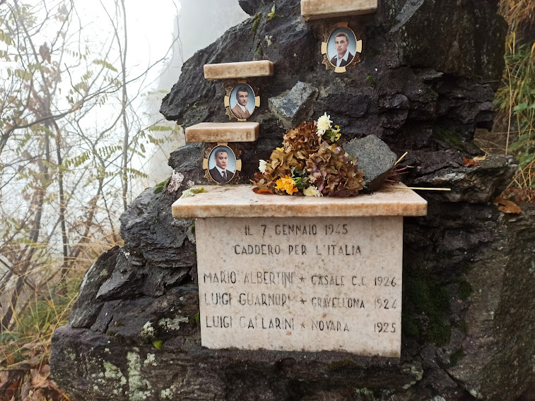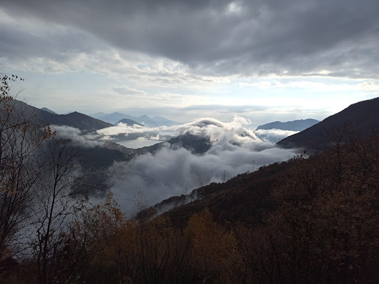 Incontriamo un piccolo monumento a tre ragazzi di vent’anni che morirono qui per la loro patria nel 1945. Troviamo anche una galleria. Attraversiamo una leggera nebbia e ne usciamo ad incontrare i primi sprazzi di sole. Dopo un’ora e mezza raggiungiamo l’Alpe La Solitudine, 835. All’Alpe Barumboda, 975, dopo un’altra mezz’ora, lasciamo la mulattiera e seguiamo verso sud una pista, lungo la quale incrociamo una piccola condotta forzata, traccia della presenza, anche qui, dell’Homo Idroelettricus.