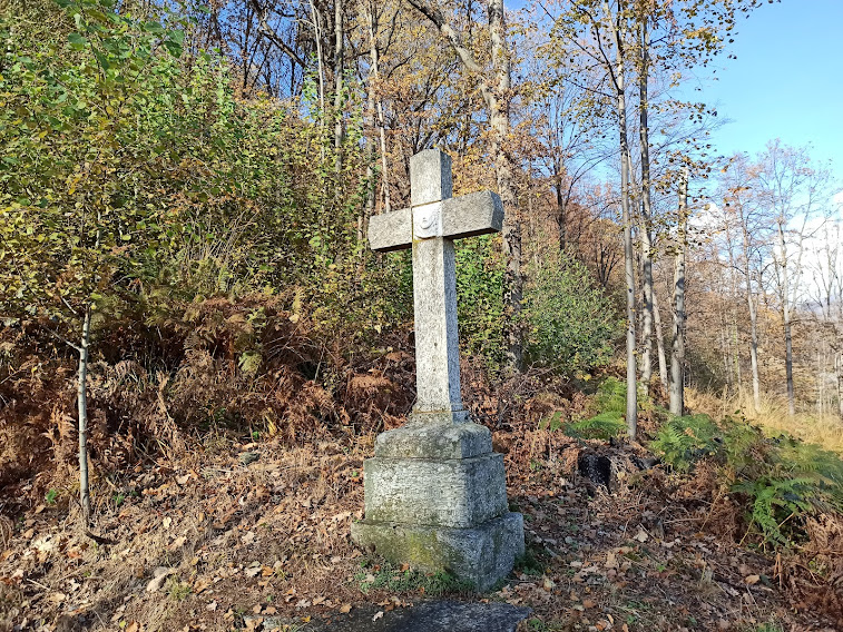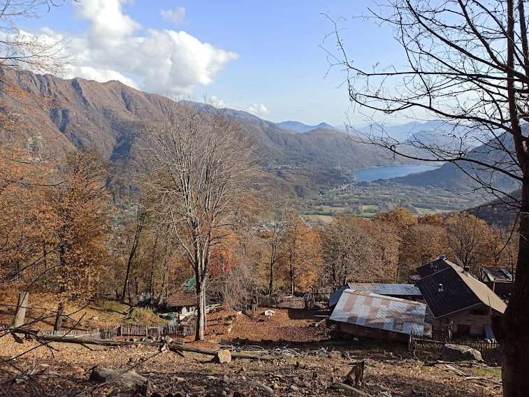 Rapidamente arriviamo ad incrociare la strada asfaltata che sale dal Boden a Cortevecchio. Siamo a quota 1020, poco sopra l’Alpe Frasmatta, e di qui scenderemo soltanto. Ci concediamo, al sole, una tranquilla pausa. Attraversiamo Frasmatta, 973, che, come altri su questa montagna, più che un alpeggio è un paesino, con villette al posto delle baite. La guida indigena ci guida prima su percorso libero e poi su traccia e pista, attraverso boschi e prati, con scorci bellissimi sui laghi e sui Corni di Nibbio. Incontriamo una grande croce di sasso.