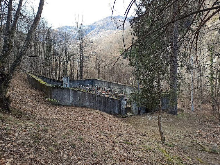 Poco prima di Pregliasca ci concediamo la terza variante per movimentare un po’ quello che, altrimenti, sarebbe il semplice e breve tragitto da Cisore a Monteossolano. Saliamo a destra sul terzo vecchio sentiero che ha riscoperto e saliamo di poco sopra quota 1000 fino ad una piccola baita in prossimità di un ruscello asciutto. Appena sotto c’è un’altra baita, nel bosco. Un altro sentiero scende da qui a Monteossolano, 784, passando più in alto del grande parcheggio e attraversando la valletta del Rio del Croppo. Camminiamo da due ore ed abbiamo raddoppiato sia il tempo che il dislivello. Il Circolo questa mattina è chiuso e proseguiamo verso l’Oratorio di San Rocco, 730.