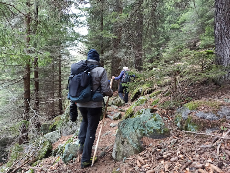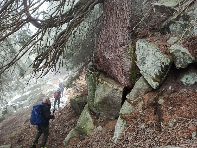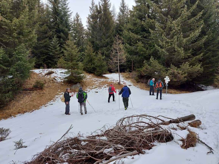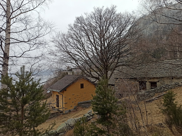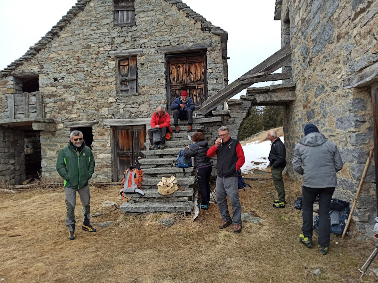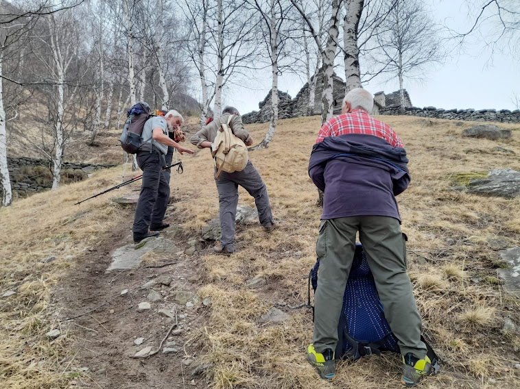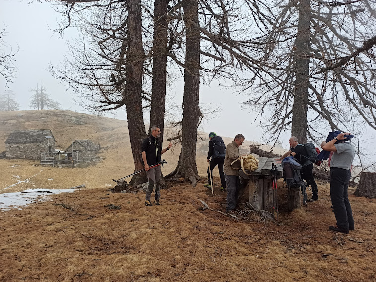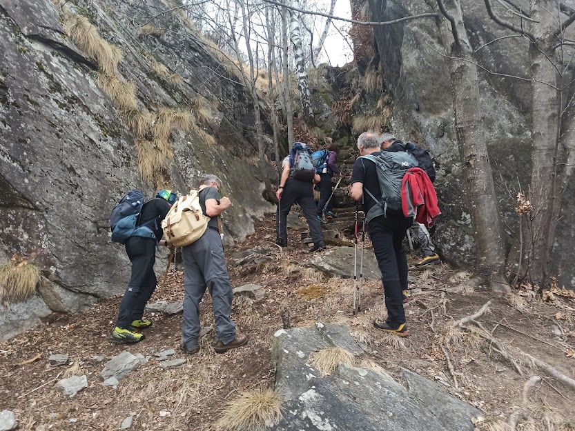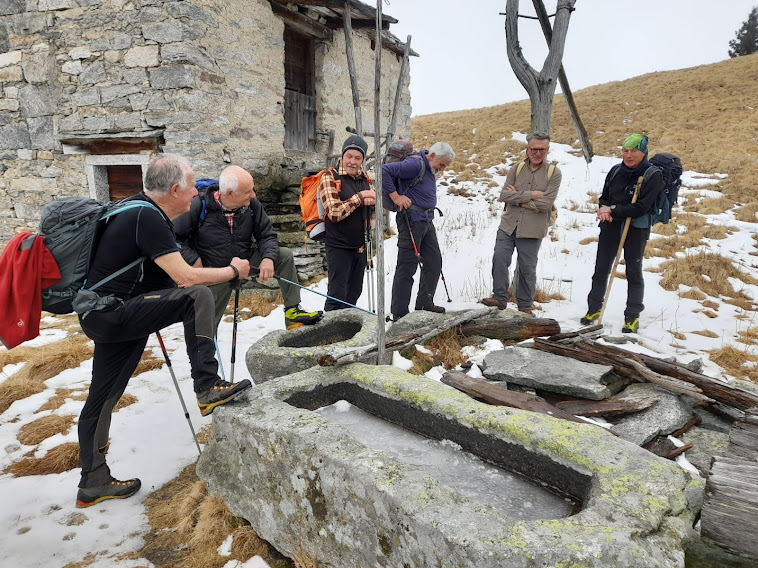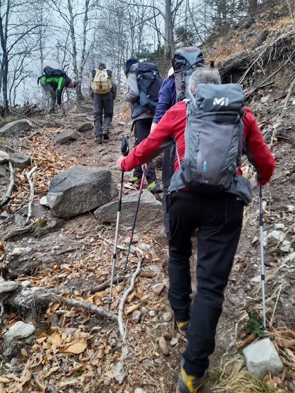 Con la consueta pazienza la forte badante porta a spasso sette anziani lungo i sentieri della Colmine di Crevoladossola. La giornata inizia un’ora prima per lo scrivente e per uno dei nostri medici di turno che è anche il progettista dell’escursione odierna. Portiamo un’auto in località Montaiou, presso l’Alpe Baratta, a quota 1300 circa. Siamo sulla strada che da Varzo sale all’Alpe Solcio passando da Coggia e Dreuza. Con la seconda auto scendiamo al bar Gufo’s, in frazione Pontetto di Montecrestese, per l’appuntamento con i verbanesi. Non è finita! Risaliamo, questa volta sulla strada verso l’Alpe Gorta, sotto la Colmine, e parcheggiamo alla palestra di roccia La Valletta, quota 760. I due autisti sono già quasi stanchi e all’arrivo sarà la stessa storia. Nuvoloso, ma asciutto, ahimè!. Non vedremo uno sprazzo di sole né una goccia di pioggia per tutto il giorno. Lungo la strada asfaltata arriviamo alla Cappella di Puzöi, 798. Seguiamo ancora la strada per un breve tratto ed imbocchiamo il sentiero A09 evidente sulla sinistra. Alle baite di Ceva di Sotto, 980, la prima breve pausa. A Ceva di Sopra, 1050, torniamo sulla strada, ma l’abbandoniamo quasi subito tenendoci a destra per una breve variante consigliata da un profondo conoscitore della zona. Infatti, allungando di poco il percorso, si prospetta la grande occasione di incontrare dei camosci che spesso soggiornano dalle parti dell’Alpe Ginestrin. Dopo una bella baita, direi villa, un ripido e breve canalino, dove si trovano delle cordine utili in caso di neve o ghiaccio, immette in una radura dove non c’è traccia degli ungulati previsti. Ritroviamo la strada, in questo tratto molto ripida, a quota 1100 e la seguiamo fino alle prime baite di Gorta, 1300, e a quelle più alte, 1330. Lasciamo la strada che sale all’Alpe La Prasca e torniamo sul sentiero A09 per un tratto pianeggiante, con baratro sulla sinistra, che conduce ad un breve strappo e ad un’incantevole valletta. Alla nostra destra c’è il sentiero che sale all'Alpe La Prasca. Noi saliamo a sinistra alla Colmine, 1702, che raggiungiamo dopo due ore e venti minuti dalla partenza, soste escluse. Non c’è più l’albero colpito dal fulmine con un grande buco alla base che formava una suggestiva cornice in cui ci si faceva fotografare con la piana dell’Ossola come sfondo. Presso il Bivacco Colmine, dedicato all’Alpino Protti Andrea, ci meritiamo una breve pausa. Qui, all’Alpe Colmine di Fuori, comincia la lunga e spettacolare dorsale fra Divedro e Antigorio che confluisce verso nord nord ovest nel massiccio del Cistella. C’è un po’ di neve. Passando dall’Alpe Colmine di Dentro, 1648, ci abbassiamo di un centinaio di metri nel fiabesco bosco di abeti, anch’esso colpito dalle tempeste degli anni scorsi. La risalita morbida, con altri brevi saliscendi, ci porta al bivio per l’Alpe Saborsone e Varzo, alla nostra sinistra. Noi proseguiamo diritti, passiamo dalla Croce di Sasso ed arriviamo all’incantevole Alpe Genuina, 1695, dove pranziamo al freddo, perché oggi del sole non c’è traccia (poco meno di un’ora dalla Colmine). Proseguiamo verso nord, alzandoci subito di qualche decina di metri fino al punto più alto dell’escursione. Di qui si scenderà soltanto, con una certa attenzione perché c’è un po’ di neve, a tratti, ma mai più di una ventina di centimetri. Dopo tre quarti d’ora siamo al Passo della Colmine, 1605. Diritti si proseguirebbe per l’Alpe Solcio, ma noi scendiamo a sinistra sul sentiero sempre evidente e senza più neve. A quota 1480 teniamo la destra verso Dreuza – Varzo, lasciando quella che è anche una pista per ciclisti acrobatici. Troviamo i primi faggi e alle subdole pigne si sostituiscono le ancor più subdole foglie. In meno di tre quarti d’ora siamo all’auto parcheggiata al mattino a quota 1300. Dopo quasi un’ora torniamo a recuperare gli altri che, nel frattempo, sono arrivati a piedi a Coggia, 820, dopo sedici chilometri di cammino.