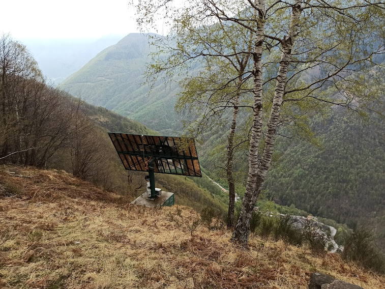 Lo raggiungiamo, diretti a oriente in piano, in pochi minuti. Il nostro è un omaggio doveroso al suo ideatore e all’impianto che ha fatto conoscere la Valle Antrona in tutto il mondo. Torniamo sui nostri passi fino ad un bivio dove teniamo la sinistra verso Viganella. All’Alpe Brig, 691, per una fortunata coincidenza, incontriamo l’inventore dello specchio, che ci offre una bottiglia del suo vino e ci aggiorna sulle sue ultime iniziative.