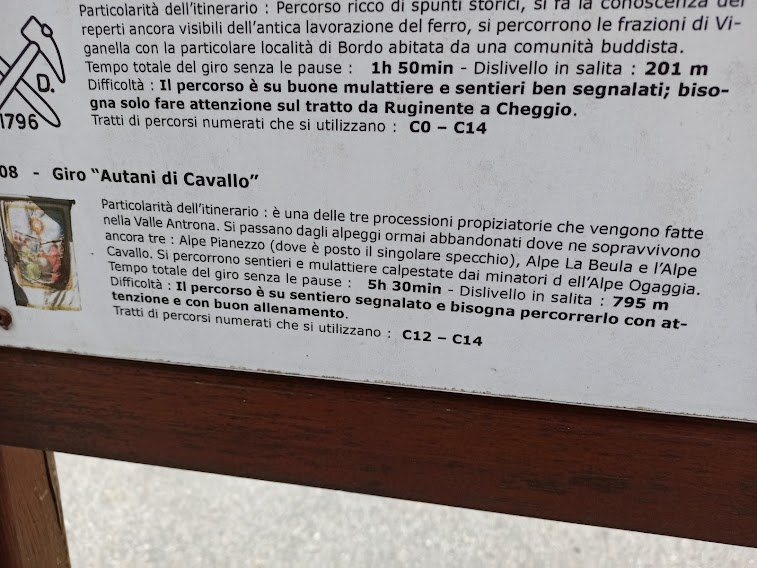 Proseguiamo per l'altra frazione Cheggio, 753 (dieci minuti), passando dalla Cappella della Mater Dolorosa o delle Dieci Croci, ed osserviamo una suggestiva casetta di legno su un albero. Il tutto con grande calma, in previsione di un’andata e ritorno veloce e tranquilla all’Alpe Cavallo, per evitare la pioggia imminente. Siamo sul sentiero C14, ben segnato e abbastanza “umano” per trovarsi nella valle celebre per le sue pendenze impietose.