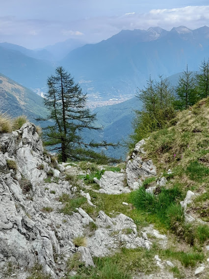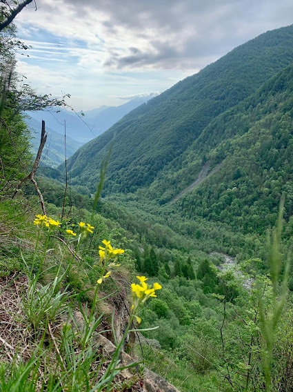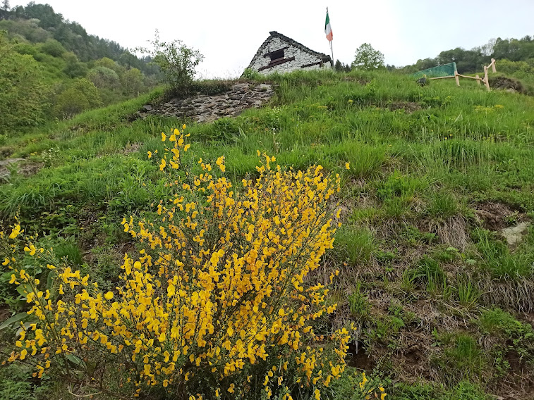 In leggera salita arriviamo in pochi minuti ad un bivio e restiamo sul sentiero basso (sinistra). Più avanti l’Alpe I Gerbi, 1217, e bellissime ginestre. Ci abbassiamo gradualmente fino a tornare alla quota di Pizzanco, sempre lungo il sentiero evidente, che però richiede attenzione perché il Bogna è raggiungibile a volo d’angelo circa centocinquanta metri sotto di noi, alla nostra sinistra. Troviamo anche un tratto con catene. Arriviamo al torrente e la morbida discesa finisce. Anziché attraversarlo su un ponte di ferro e proseguire verso il Fornalino, imbocchiamo il sentiero a destra e cominciamo a salire seriamente, restando sulla sinistra orografica. Abbiamo virato ad ovest.