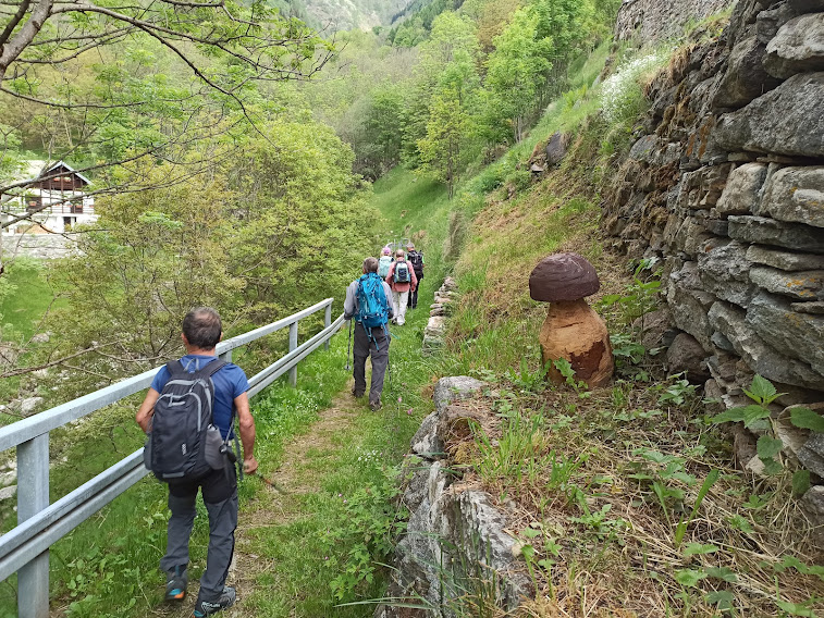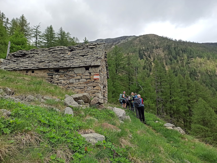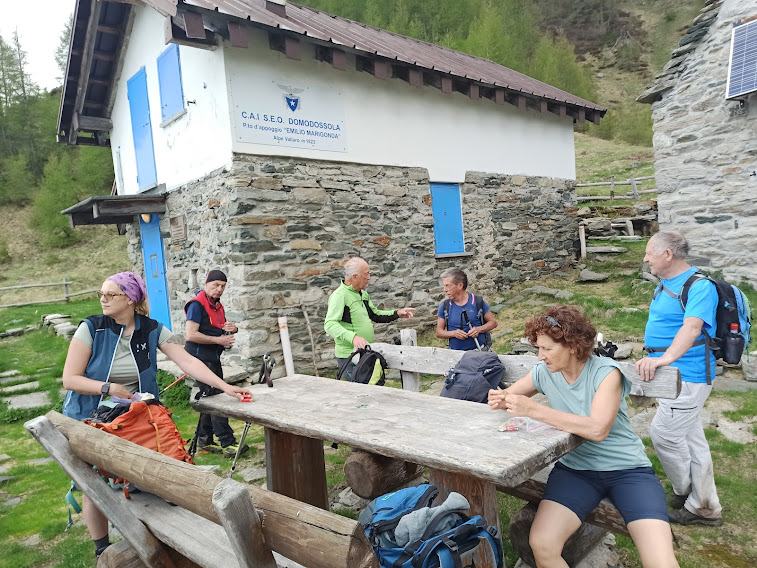 Sul sentiero D98 della GTA c’incamminiamo verso sud est fino alla croce dedicata all’Alpino Pier Angelo Borri, a quota 1930. Verso oriente, con saliscendi sul sentiero evidente, incontriamo anche la croce dedicata al pastore Tommasino Patritti, ricordato anche all’Alpe Reso, sopra Monteossolano. Dopo un’ora siamo al Rifugio Emilio Marigonda, 1821, nella conca dell’Alpe Vallaro.