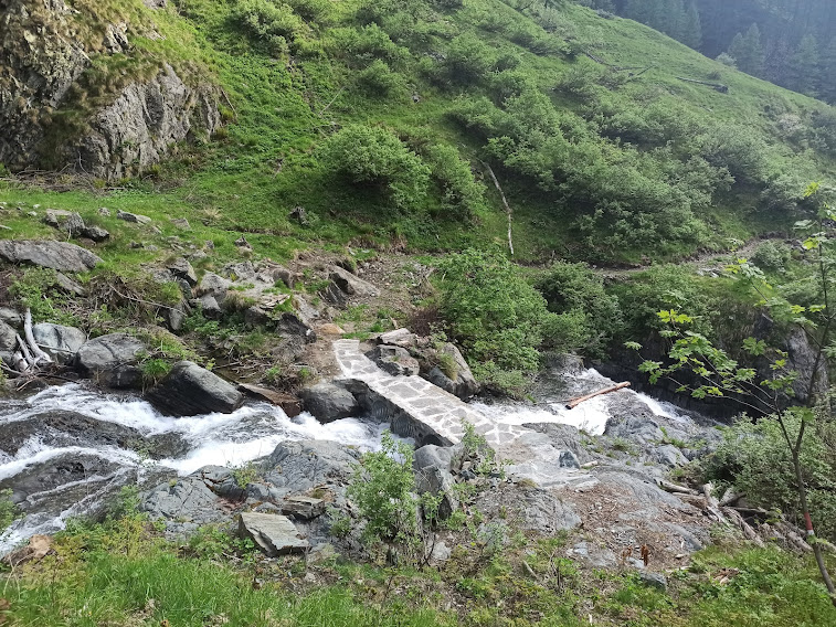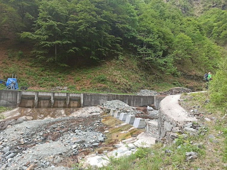 A quota 1250 circa capisco perché il Bogna non è più un torrente ma, per lunghi tratti, un rigagnolo. Troviamo le opere di presa per una delle oltre duecento centraline idroelettriche private che infestano il nostro territorio. Il cosiddetto “rilascio” o “deflusso minimo vitale – DMV” è ridicolo. Da qui in su c’è un torrente e ci sono anche i pescatori.