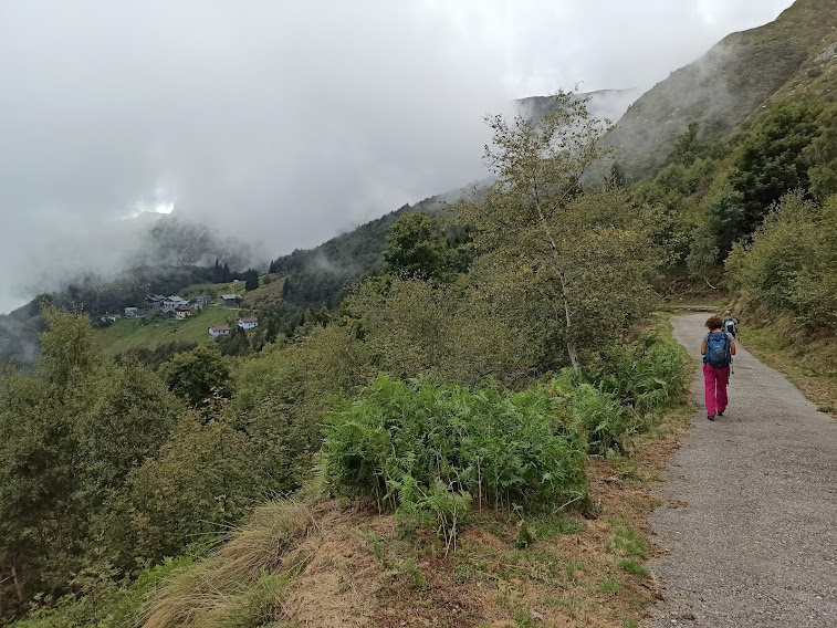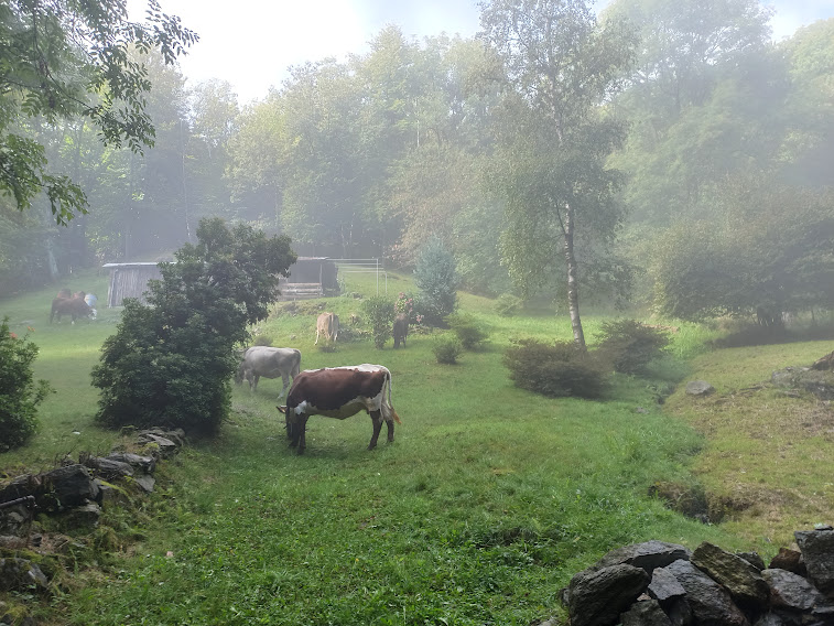 La seguiamo integralmente passando da Casalecchio, salvo un breve taglio su sentiero per saltare qualche tornante, ed arriviamo a Ronch, 700. Prima di Frasmatta incrociamo dei pastori con le loro mucche al pascolo. Stanno scendendo gradatamente dagli alpeggi alti. Un altro breve taglio di tornanti prima dell’alpe, 973 (un’ora e mezza), dove ci sono belle casette e villette e di baite nessuna traccia.