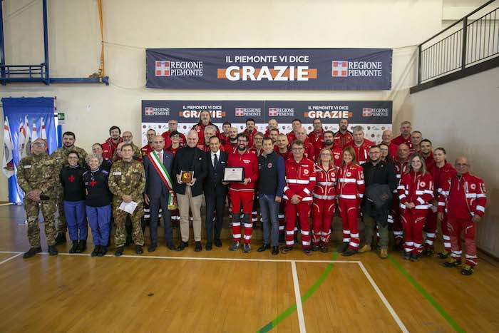 Durante la cerimonia sono state consegnate le targhe di riconoscimento alle competenti regionali e ai loro referenti: Daniele Cora di AIB, Vittorio Ferrero di CRI, Marco Lumello di ANPAS, Marco Lumello di ANC, Luca Gja Arcota del Soccorso Alpino, Giancarlo Bosetti di ANA, Marco Fassero del Coordinamento Regionale Protezione Civile e agli otto coordinamenti territoriali: Andrea Morchio - Coordinamento di Alessandria, Valter Marenco - Coordinamento di Asti, Cleto Canova - Coordinamento di Biella, Roberto Cagna - Coordinamento di Cuneo, Gianfranco Zanetta- Coordinamento di Novara, Leonardo Capuano - Coordinamento di Torino, Francesco Corri Coordinamento di Verbania, Dario Colangelo - Coordinamento di Vercelli.