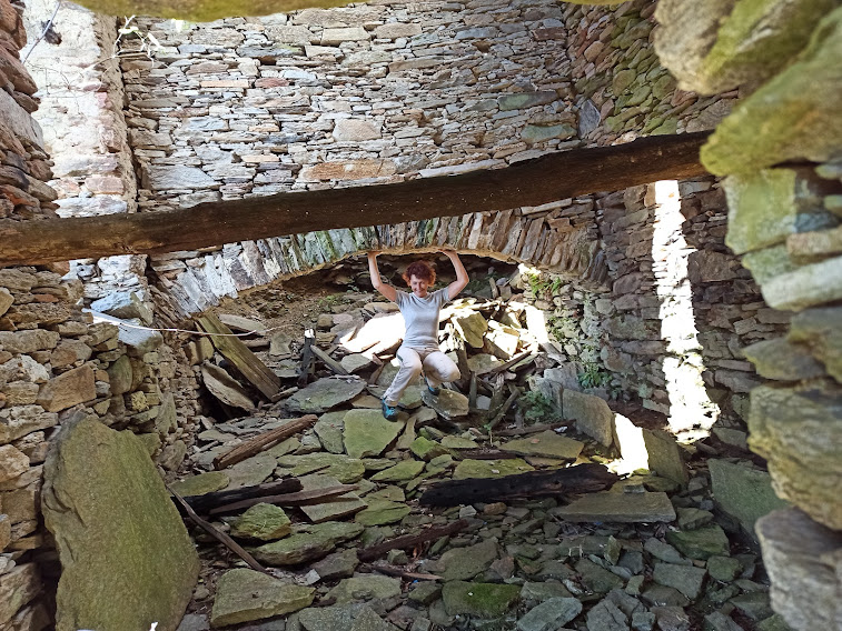 Teniamo la destra (sentiero R09a) e scendiamo, anche qui con un po’ d’aiuto tecnologico, ad attraversare nuovamente il San Giovanni a Usciago Fondo, 600. Intragna sembra sempre più vicina. Ci sono poco più di cento metri di risalita, quasi un gioco da ragazzi. Ma ecco la sorpresa! Aldilà del ponte il sentiero evidente sale subito ripido e piuttosto impervio e continua a salire fino all’altezza di Usciago Cima, 845, dove chiudiamo l’anello odierno.