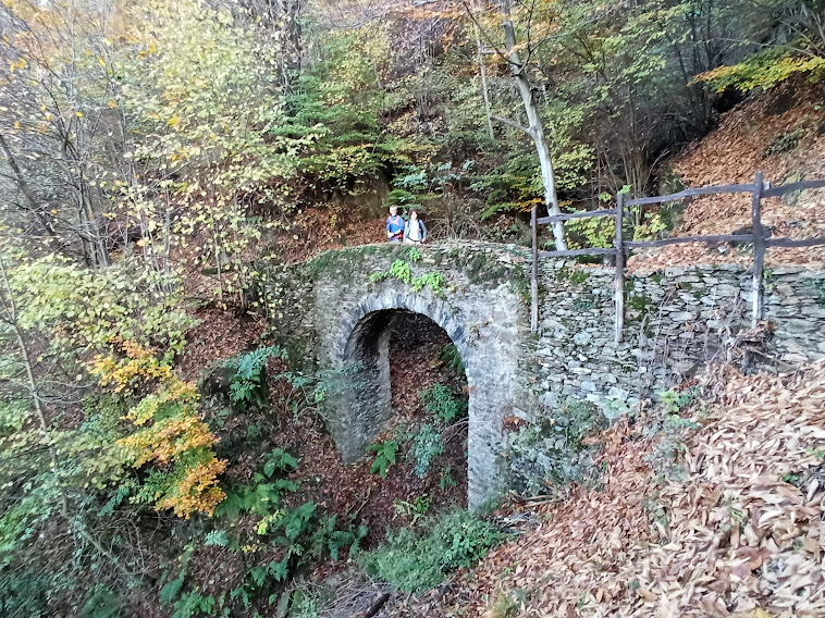 A me sembra di essere quasi arrivato a Intragna, anche se un cartello indicatore malvagio parla di due ore e un quarto. Proseguiamo la discesa sul sentiero R11 in direzione di Scareno e, poco prima del Ponte del Dragone, troviamo il bivio per Intragna. Qui un cartello ancora più malvagio conferma le due ore abbondanti.
