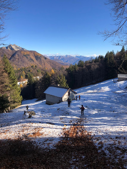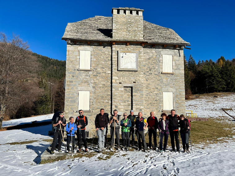 Iniziamo a scendere, passando dalla Colma di Villette, dove le nostre badanti si consentono una meritata pausa ed un giro in altalena. Diretti a nord est, in questo territorio meraviglioso, attraversiamo un vasto prato innevato dove una grande villa in sasso fa da sfondo alle nostre foto di gruppo. Il panorama va dal Gridone ai quattromila.