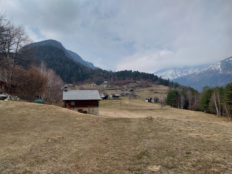 Prendiamo questo sentiero e iniziamo a salire addentrandoci nella valle del torrente Cairasca. Siamo sul suo versante occidentale. Passiamo da ruderi di alpeggi nel bosco (Lei?, Valcrosa?) e raggiungiamo un altro alpeggio non identificato, a quota 1000 circa e poco sotto la strada che sale a Trasquera. Dopo la pausa colazione in pochi minuti arriviamo sulla provinciale, in corrispondenza dell’Alpe Cioina di Fuori.