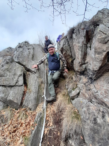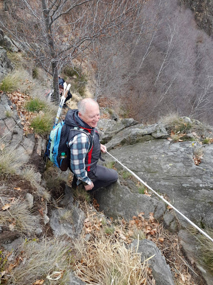 Ora la salita si fa più impegnativa e ripida, su una traccia esile con passaggi esposti e non assicurati e con alcuni passi di primo grado che, vista l’età media dei partecipanti, vengono classificati come 7 c. Si mette a capofila l’anziano ex-alpinista che però sbaglia completamente scelta dei rapporti ed andatura e va rapidamente in debito d’ossigeno, creando non poche preoccupazioni ai medici della spedizione; fortunatamente, però, anche per oggi non è stato necessario intonare il “Signore delle Cime”.