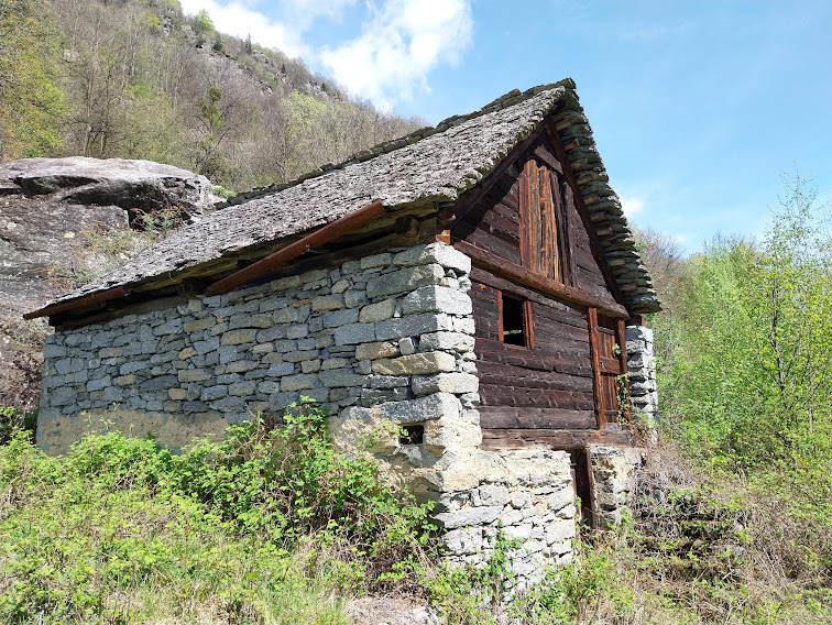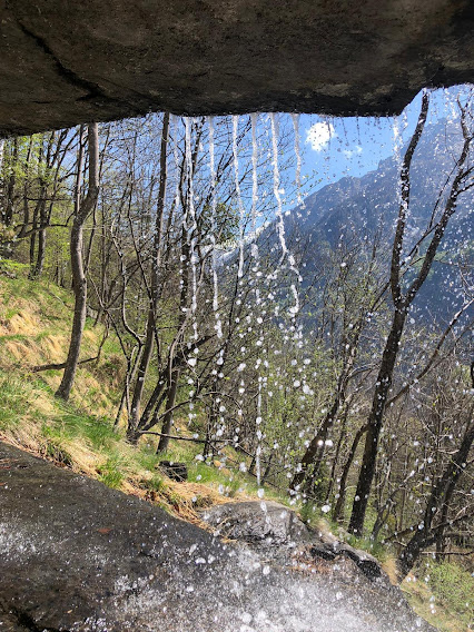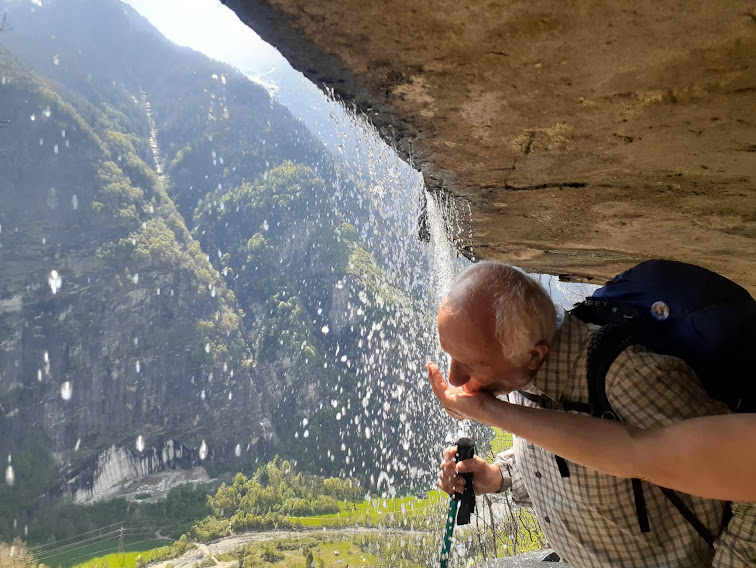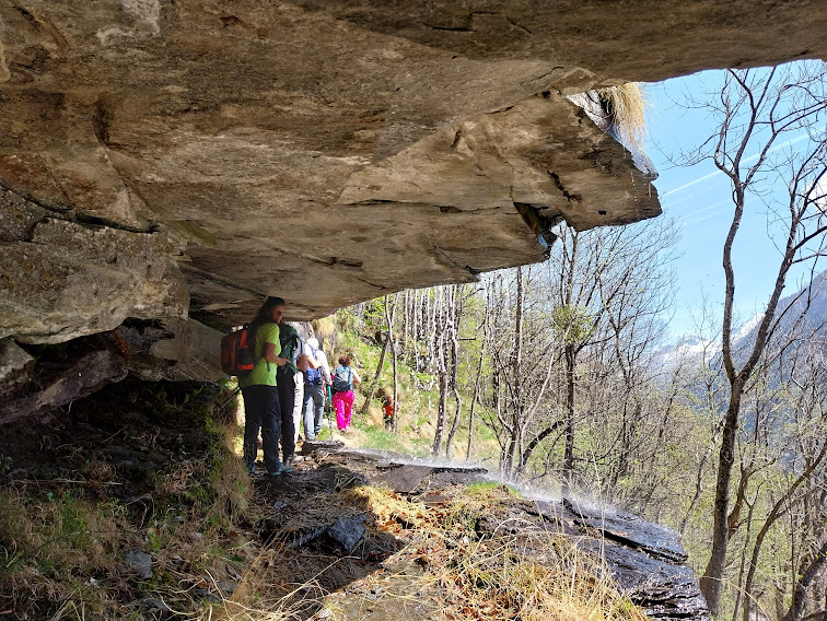 D’ora in avanti leggera discesa con qualche breve risalita. Rapidamente arriviamo a Fiume, 1175, e ci concediamo un’altra pausa. Più avanti un pezzo di sentiero in salita è al coperto grazie ad un colossale tetto di granito sul quale, in un tratto, scorre l’acqua formando una cascatella che si presta a foto suggestive. Ad un bivio lasciamo alla nostra sinistra il sentiero per Altiaccio e, dopo tre quarti d’ora, arriviamo, per l’ennesima pausa ricreativa e culturale, a La Pioda, 1001.
