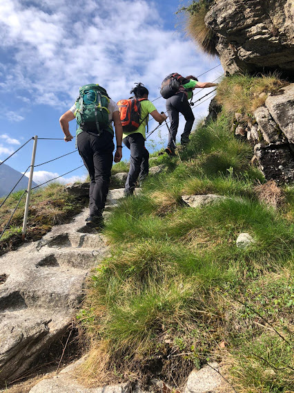 La nostra fede non vacilla e cominciamo a salire in presa diretta, quando termina la pista al disopra un muro ciclopico di enormi blocchi. Un tratto di mulattiera e poi sentiero, più in alto ben attrezzato con gradini scavati nel granito, ringhiere, scalette di ferro. Il tutto a picco sullo strapiombo, ma in tranquilla e totale sicurezza, con bellissimi panorami su Antigorio e Ossola. Sopra il precipizio entriamo in un ripido bosco di faggi ed il tragitto ad alto rendimento ci porta al Bacino (che è nel cuore della montagna) a quota 1200.