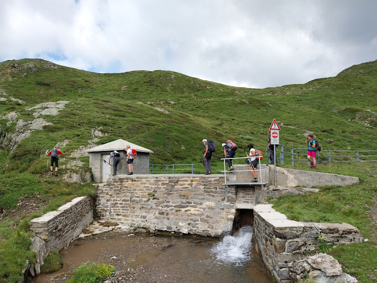 Dopo una breve pausa ci dirigiamo a nord ovest sul sentiero G28 diretto alla Punta di Valrossa. Lungo il percorso continuiamo ad osservare robuste vacche il cui latte verrà presto trasformato in prezioso formaggio Bettelmatt. Dopo una brevissima pausa per “abbeverarci” a Baita Darioli, 2235, saliamo rapidamente ad attraversare il Rio Rotental in corrispondenza della dighetta da cui parte la condotta verde in bella vista che porta l’acqua al Lago Castel, circa cinquanta metri più in basso.
