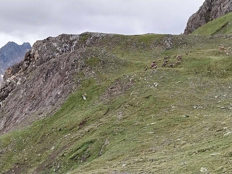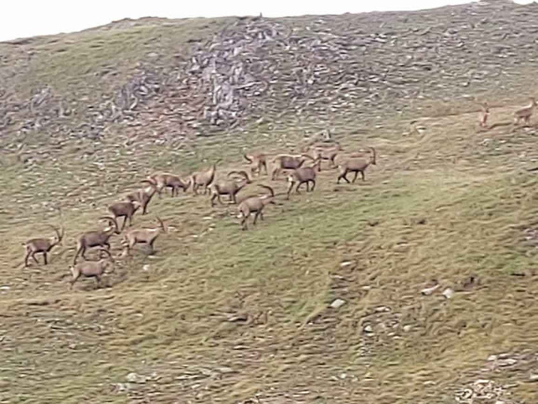 Di neve solo scarsissime tracce sulle rive dello specchio d’acqua. Ci teniamo a sinistra e ci alziamo di qualche decina di metri sui contrafforti che delimitano il lago a sud per avvicinarci ad una grande mandria di stambecchi, che cerchiamo di fotografare e filmare. Chi ha la vista migliore ne conta ventotto, con conferma di due ex cacciatori. Con tutta calma si allontanano, attraversando con grande facilità un terreno impervio e proibitivo per noi bìpedi.