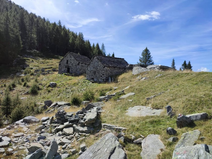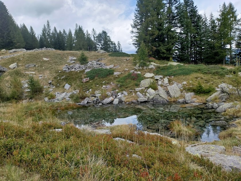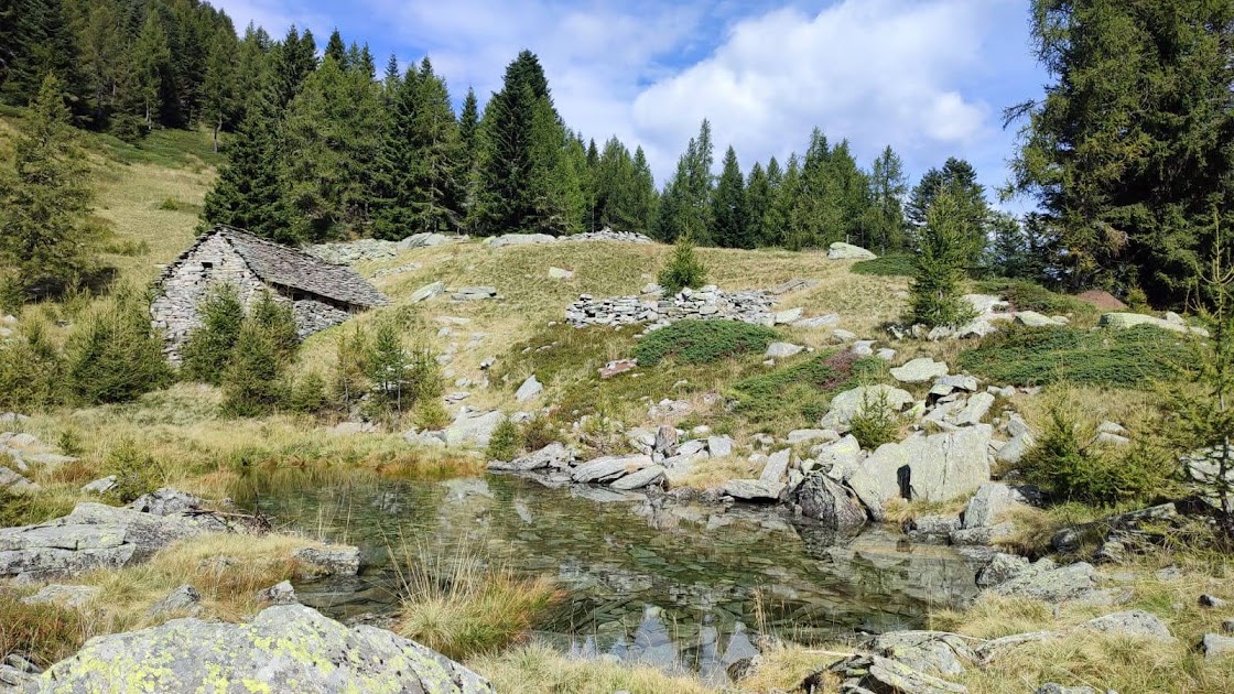 L’ambiente è bellissimo, c’è anche un piccolo specchio d’acqua. Durante la breve pausa osserviamo con dispiacere che la bella baita, dove sostavamo per il pranzo durante le precedenti salite al Ruscada, ora è diroccata e ci sono segni di un incendio. Si procede in salita, sempre diretti a est, fino ad incrociare il sentiero che sale dai Monti di Comino, sopra Verdasio, Centovalli.