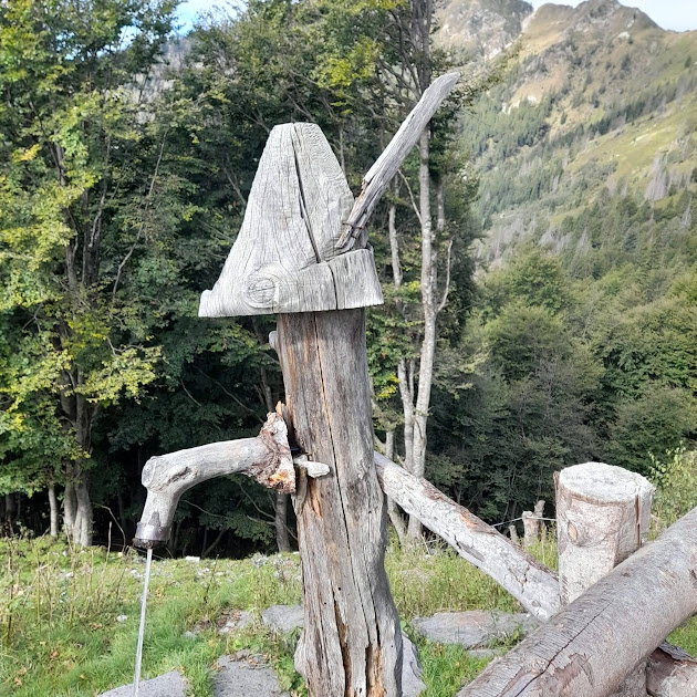 Camminiamo da un’ora e tre quarti. Breve pausa in prossimità della fontana con cappello da Alpino in legno. Riprende la salita in un rado e ripido bosco. Poco sopra troviamo un bivio: a sinistra il sentiero M 41 prosegue verso l’ Alpe Caneto, noi teniamo la destra sull’M41a che seguiremo fino al confine con il Canton Ticino, a oriente. Arriviamo alla Bocchetta di Cortaccio, 1674, e all’Alpe in leggera discesa.