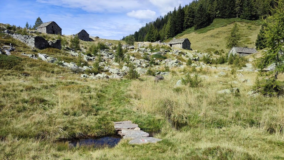 Adesso il percorso sarà quasi pianeggiante, con saliscendi che incrementeranno il dislivello, fino all’Alpe Ruscada. Nel prato che sale verso la punta della Forcoletta stiamo ben attenti ai segnali, che adesso esistono e ci riconducono a sinistra, nel bosco. Più avanti superiamo i cippi di confine e raggiungiamo l'Alpe Ruscada, 1674, dopo quasi un’ora e un quarto dall’Alpe Rovina.
