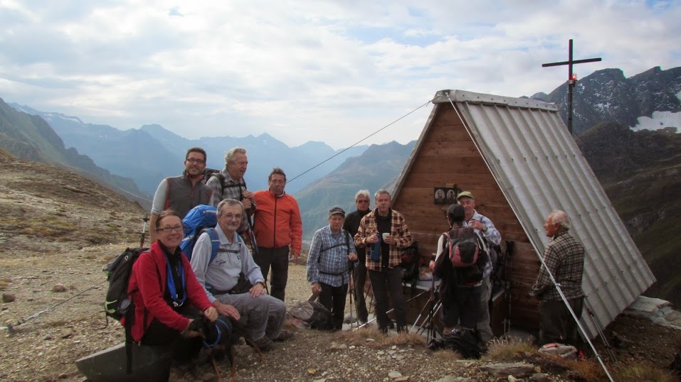 Ce la siamo presa, fin qui, con tutta calma, in attesa di un amico che oggi tarda a trovare il giusto assetto. Sempre diretti a nord, alla fine del grande pianoro imbocchiamo il bel sentiero, frequentato anche da mountain-biker, che ci porta in un'ora al Passo del Gries, 2469, sul confine svizzero. Qui sostiamo per la colazione in prossimità della cappella – rifugio edificata nel 1964 ad opera dei superstiti della tragedia del 28 – 29 dicembre 1953, allorché trovarono la morte tre giovani scout.