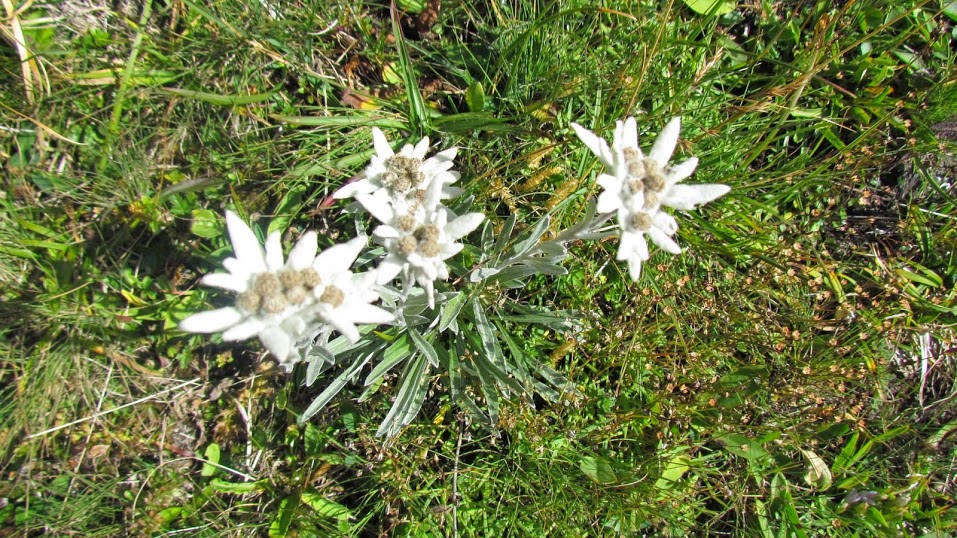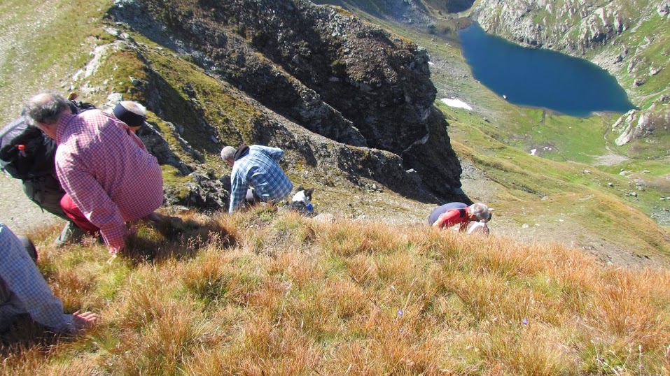 Gli altri, meno professionisti, si portano sulla “parete est” (non del Rosa!), dove c'è più sole. Alla prima difficoltà abbandonano gli zaini e, su terreno molto ripido, salgono in vetta, quota 2684. Quasi un’ora e un quarto dall’Alpe Naga. La cima, effettivamente, è un po' “aerea” e compare una corda che darà un po' di tranquillità in più a qualcuno nella discesa fino agli zaini. Asia e Willy, con la loro trazione integrale e “guinzagliati”, non hanno problemi. Si ridiscende verso Naga e si pranza in riva ad un torrentello. Prima dell'Alpe della Valle viriamo a sinistra e, aldilà del Rio della Valle, risaliamo qualche decina di metri. Siamo in pieno “grande Est”.