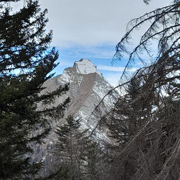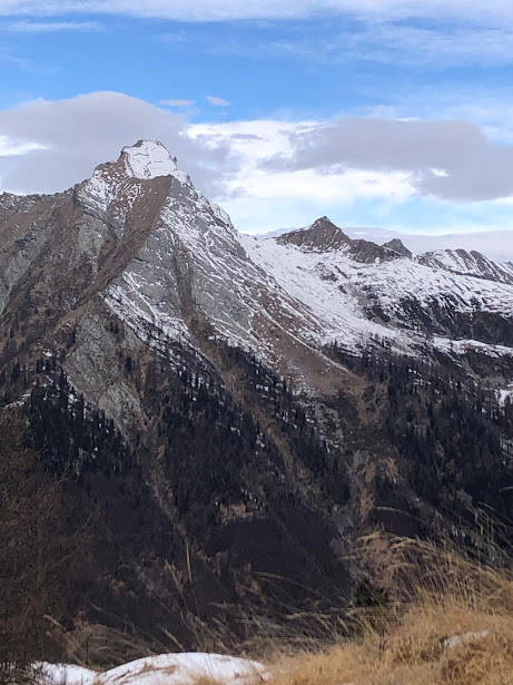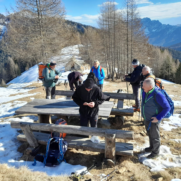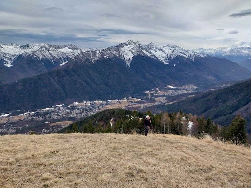 Pausa tranquilla con bellissimo panorama della Valle Vigezzo sotto un cielo grigio. Lungo il prato ripido, passando da altri nuclei di baite e lasciando alla nostra destra la pista che prosegue verso La Piana, arriviamo a La Cima, 1803, dopo un’ora e tre quarti di cammino effettivo. Il sole non ci scalda ancora, anzi un’arietta frizzante ricorda l’inverno, ma sarà una breve illusione. Di neve solo qualche accenno, ma siamo saliti lungo un versante esposto a sud.