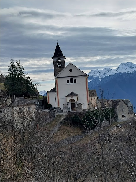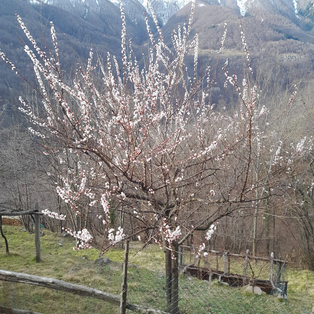 Nuvole e sprazzi di sole. Ci siamo accordati per un’escursione senza neve vagando su e giù per la bassa Val Bognanco. Oggi si rinforza ulteriormente la squadra delle badanti grazie ad un’esordiente. Quattro signore, quindi, si prendono amorevolmente cura, insieme al medico di turno, di quattro anziani. E c’è anche la piccola Asia, border collie. Troviamo fortunatamente due parcheggi appena prima del ponte sul Bogna in località Torno, 435. Passiamo sulla sinistra orografica e, lungo la provinciale, ci portiamo in località Gabbio, 465.