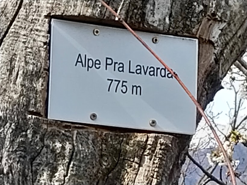 Ci godiamo lo stupendo panorama verso l’Ossola da questo bellissimo pianoro con una grande baita in ottimo stato. E’ presto e decidiamo di fidarci coraggiosamente dell’anziana guida acciaccata che vuole salire ancora per vedere dove ci porta la traccia alla sinistra della baita. La seguiamo su terreno sporco e, in un breve tratto, molto ripido fino all’Alpe La Colla, 906. Incontriamo dei cartelli azzurri “artigianali” che indicano “Curt Drigioni – EE” verso sinistra e “Ramella – Nava” verso destra. Ci diranno però degli amici, che incontreremo più tardi, che la nostra decisione di dare ascolto allo stomaco e di tornare a Prà Lavarda per il pranzo sullo splendido tavolo panoramico è stata saggia (meno di tre quarti d’ora per andata e ritorno a La Colla).