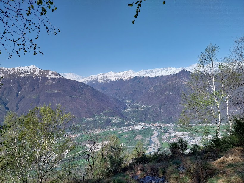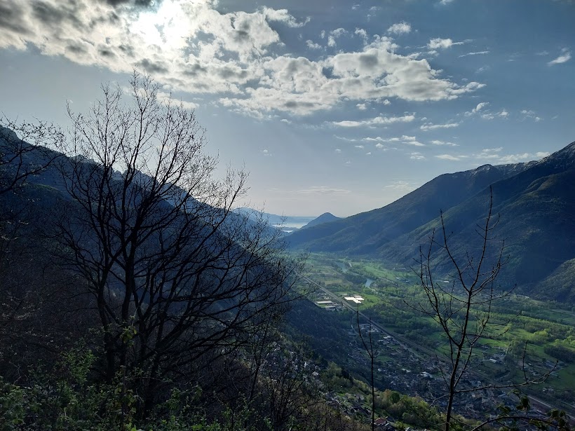 Lungo tratti anche molto ripidi arriviamo all’Alpe Sui di Sopra, 1220, dove troviamo baite, alcune diroccate (quasi un’ora e un quarto da Capraga). Qui si trova anche l’arrivo di un chilometro verticale che presumo parta da Vogogna, quota 226. E’ un bellissimo punto panoramico sull’Ossola e sul Monte Rosa. Merita la lunga pausa pranzo, in tenuta quasi da spiaggia. Con spirito d’avventura, che verrà premiato, in discesa ci teniamo a sinistra, dove, in corrispondenza di un ometto, inizia un sentiero molto evidente e pulito, indicato come “non segnalato” e “difficile” sulla cartina.