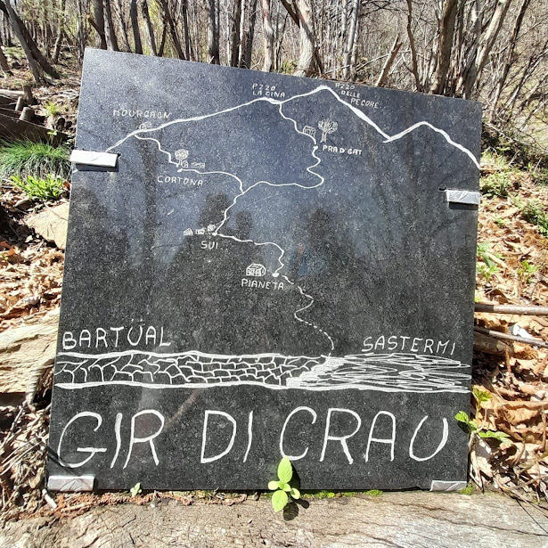 E’ diretto a sud est, molto ripido, da percorrere con normale attenzione, ma non lo definirei “pericoloso”. Ci porta all’Alpe Pianetta o La Pianeta, come qui si legge. C’è una baita aperta, un piccolo “Museo”, tutto è pulito e ordinato. Complimenti a chi la mantiene così e si fida del prossimo! Il sentiero confluisce sull’ A36, che coincide con la pista sterrata fra Capraga e Sasso Termine. Una grande lastra lucida di sasso ci dice che siamo sul “Gir di Crau”. Noi teniamo la sinistra (oriente) ed arriviamo a Sasso Termine, 954. Qui c’è tanto sasso, baite in piedi e diroccate. Una che mostra solo cemento sembra un pesce fuor d’acqua.