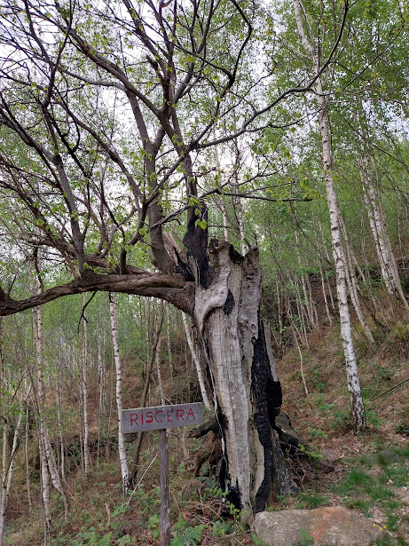 O meglio, questo sarebbe il programma. In effetti il bel sentiero è molto diretto, ripido, con qualche comoda ringhiera e cordina che aiutano l’anziano viandante. Dopo poco più di un’ora da Anzola siamo a Pian Sola, 650, dove viene raccontata la leggenda del Pidèn, l'enorme essere magico che aiutò Dio a completare il mondo e che, cadendo dall'alto, lasciò su uno di questi massi l'impronta del suo sederone. Qui termina la Stra’ Dricia e, fino a pochi anni fa, terminava anche la strada carrozzabile  che adesso prosegue fino a Piazza Grande. I criteri costruttivi ormai sono quelli “moderni”, anche se il legname è raccolto e ordinato, mentre il sentiero A33, per ora, è “massacrato” solo in un breve tratto, dove incrocia la strada che, evidentemente, non è ancora ultimata.
