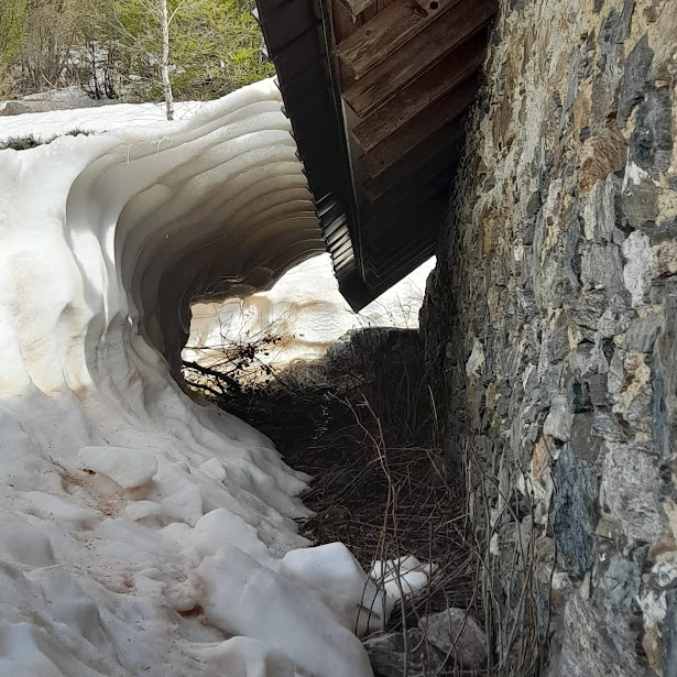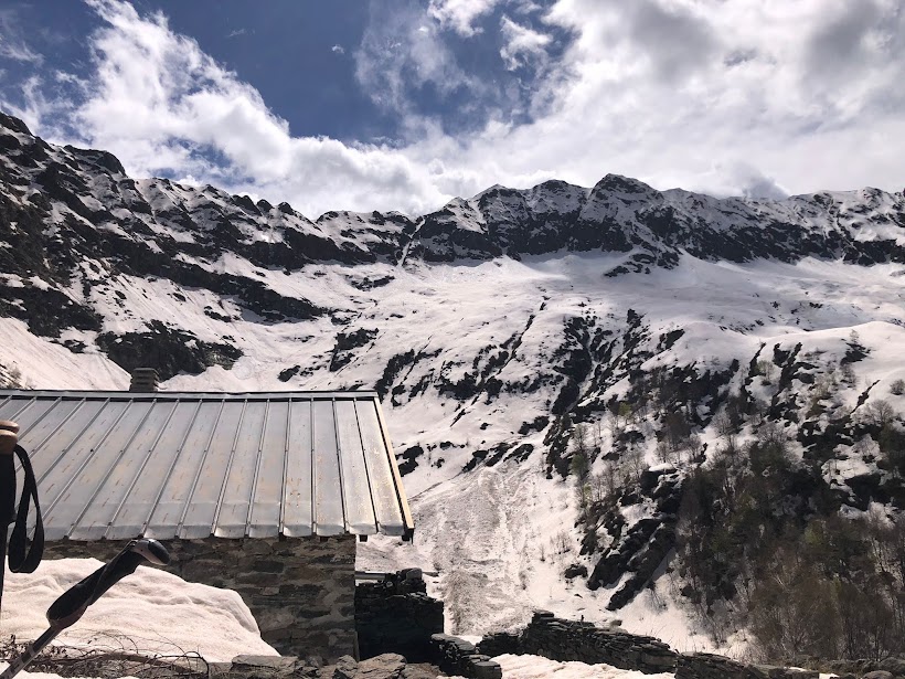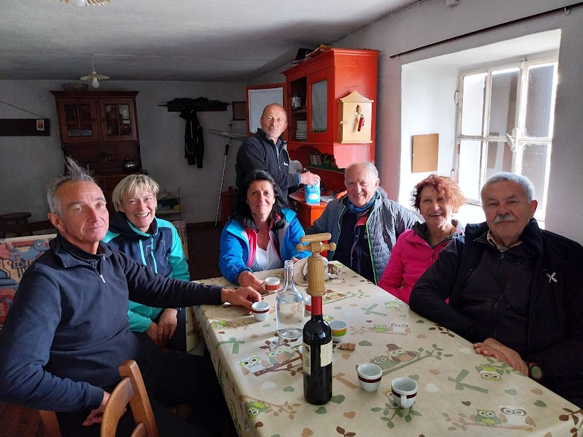 Una grossa valanga fra noi e l’Alpe Drosone Dentro smorza fortunatamente le velleità degli amici e ci fermiamo a pranzare e contemplare al sole, ma non al vento, festeggiando con torta e altre leccornie delle nostre badanti pasticcere il compleanno di una di loro.  Durante la discesa ci offre un graditissimo caffè nella sua bellissima baita a La Tagliata una di quelle persone che ti fanno apprezzare ancor di più le bellezze della montagna e della magica atmosfera che la circonda.