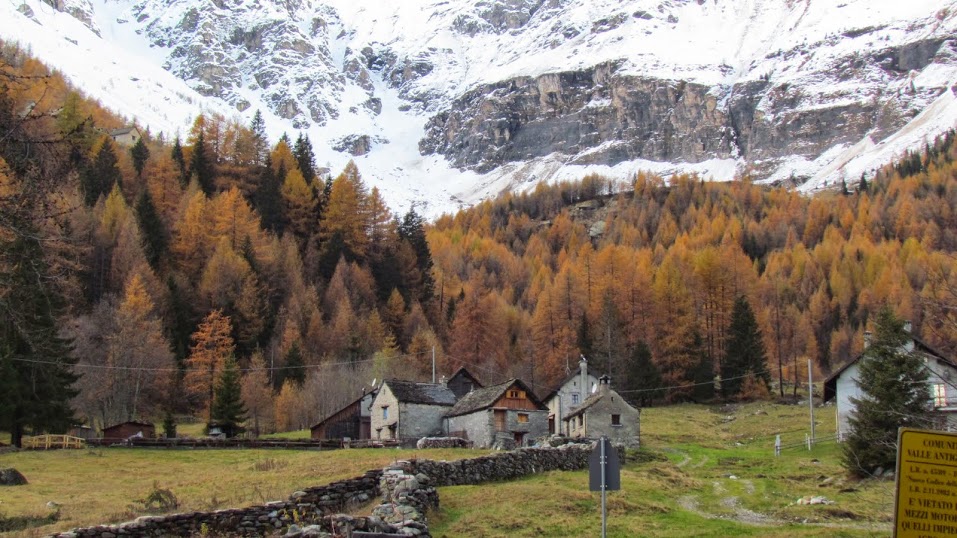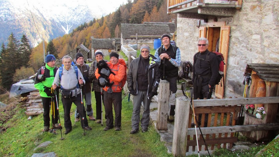 Di qui la proporzione, quasi matematica: l'Inghilterra sta all'Italia come Stonehenge sta ai “Sass dul Pass”. Insieme ad un maturo maestro di sci del posto, io proseguo in auto per circa due chilometri fino a Chioso, 900, e salgo direttamente, lungo strada e mulattiera, agli alpeggi di Vova, 1492, e, di qui, al Motto, 1600, dove si trova la baita – ristorante (strettamente privato!) del nostro ospite, oggi assente (quasi un'ora e tre quarti da Chioso). Gli altri otto da Passo raggiungono Salecchio Inferiore, 1312, lungo strada e sentiero in poco più di un'ora. Qui si respirano secoli di storia ed è sempre emozionante, ma se ne sono già occupati in molti, prima e meglio di me.