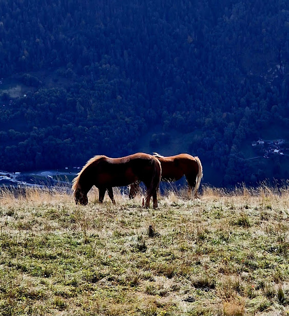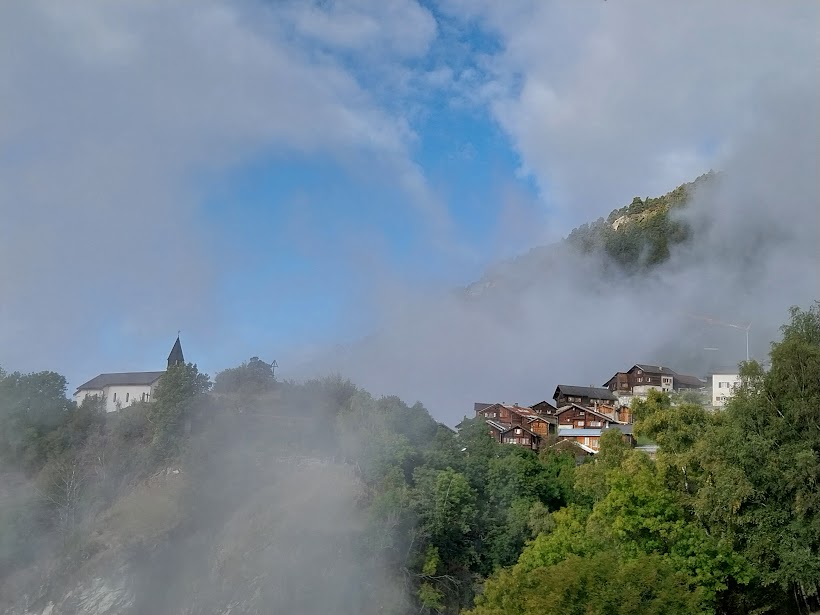 Dopo pochi minuti ci gustiamo il primo panorama sulla valle del Rodano da una cappella nei pressi di una croce che viene illuminata solo in occasione di una morte nel paese, per una vecchia tradizione. Più avanti lasciamo la pista diretta per Jeizinen e imbocchiamo il sentiero per Bratsch, sempre diretti ad occidente.