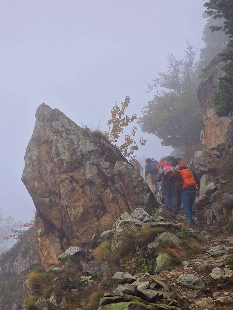E ha smesso di piovere: porteremo gli ombrelli a spasso dentro lo zaino per l’intera giornata, con nebbia, vento fresco e persino un po’ di sole. E’ stata comunque scelta l’opzione 2, programmata in caso di maltempo, da quota 600 a quota 1570. L’opzione 1, programmata per tempo bello, prevedeva partenza da Jeizinen, quota 1570, e giro ad anello fino a quota 2400.