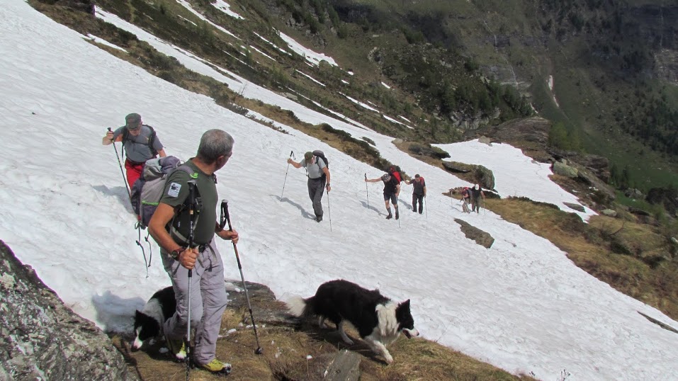 Reso omaggio al maestro, che non potrà essere dei nostri, e alleggeriti gli zaini, proseguiamo in direzione ovest lungo il ripido sentiero che ci porta all'Alpe Tanzonìa, 1912. Breve sosta per ricompattare il gruppo. Tre amici si fermano qui per motivi diversi quali la ricerca del cane spaventato dalle esplosioni nelle cave, un ginocchio in convalescenza, lo scarso allenamento. Li ritroveremo al Motto. In dodici riprendiamo il cammino, alzandoci di circa duecento metri e puntando poi decisamente a sinistra (sud – sud est) lungo una traccia in falsopiano che, attraversati alcuni residui ripidi nevai, ci consente di “scollinare”, a quota 2100 circa, sul versante di Salecchio. Traccia verso destra (ovest), in dolce salita prima e su pendio ripido poi, fino alla bocchetta, 2150 circa (un’ora e tre quarti dal Motto).